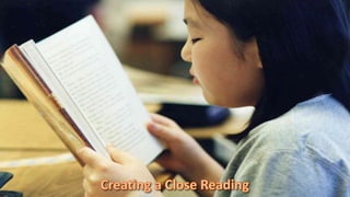 The document discusses strategies for teaching close reading skills to elementary students. It recommends using short passages and having students re-read text with questions. Teachers should provide background knowledge and modify questions based on reading levels. Creating text-dependent questions involves identifying key ideas and addressing vocabulary, structure, and standards. Close reading lessons should build confidence and tackle difficult sections. Illustrations can also be closely read to improve comprehension.