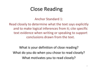 This document provides strategies and resources for teaching close reading to students. It discusses three strategies: 1) Know/Wonder, where students track what they know and wonder while reading; 2) Six Signposts, where students look for contrasts, realizations, questions, advice, repeated elements, and memories while reading; and 3) Reading Multiple Times with Purpose, where students do an initial independent reading, partner discussion, shared reading with a teacher, and answering text-dependent questions. It also provides examples of implementing these strategies and lists various short story and non-fiction resources suitable for middle grades.