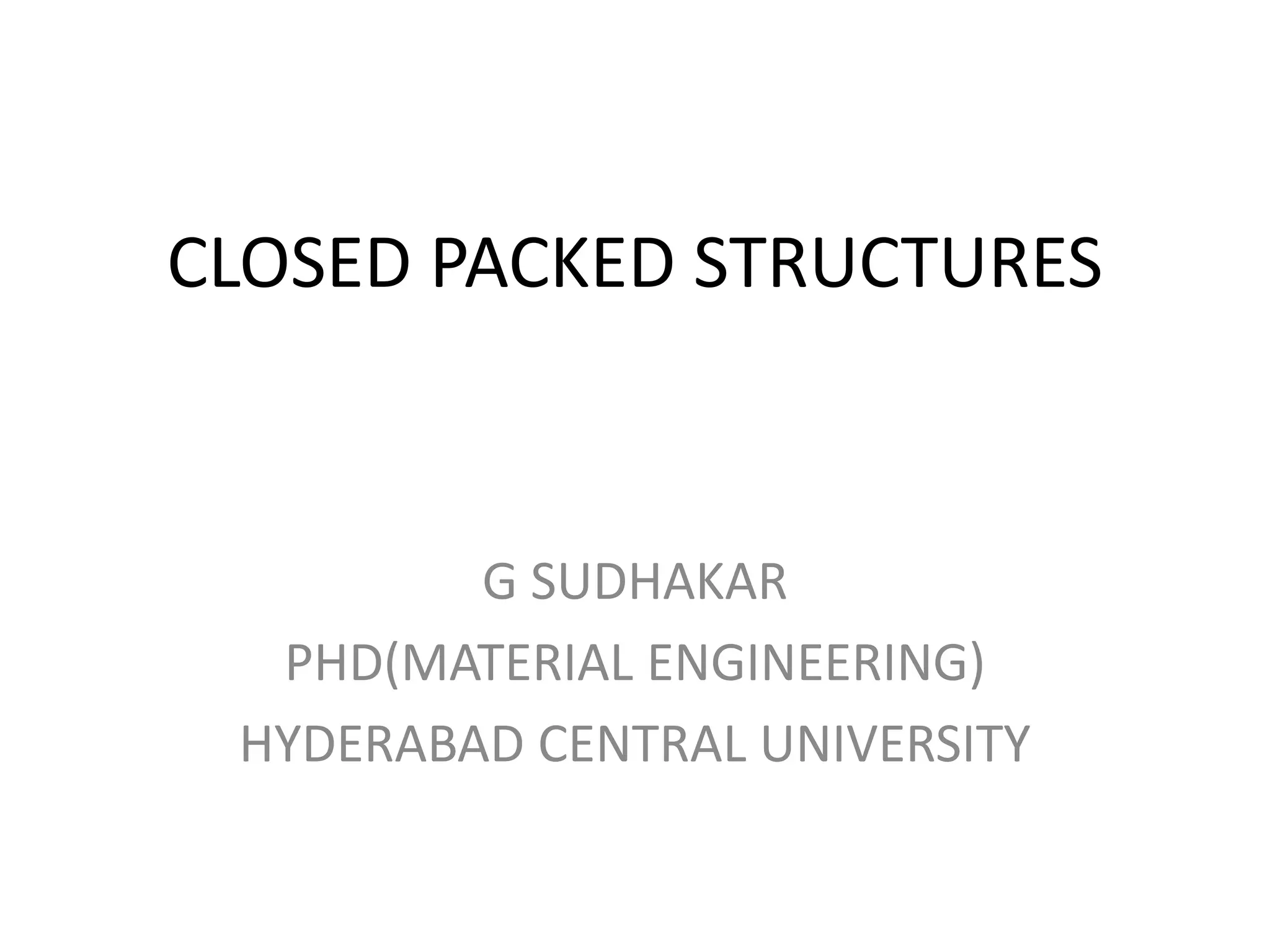 Closed packed structures are crystalline arrangements where atoms or molecules are packed as densely as possible. Dr. G Sudhakar, who holds a PhD in Material Engineering from Hyderabad Central University, is an expert on closed packed structures. His research focuses on understanding the properties and behaviors of different closed packed crystalline structures.