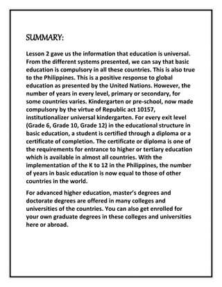 Lesson 2 discussed how education systems around the world generally require basic compulsory education, though the number of years required varies by country. In the Philippines, kindergarten is now mandatory under Republic Act 10157. Students receive a diploma or certificate upon completing each level of basic education, such as grade 6, 10, or 12, which is required to advance to higher education available in most countries. With the K-12 program, the Philippines now has the same number of years in basic education as other countries. Advanced higher education such as master's and doctoral degrees can be obtained in many colleges and universities both in one's home country and abroad.