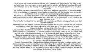 This document is a prayer thanking God for bringing people together to work as a team using their individual gifts. It asks God to help the team operate with humility, share credit, and complement each other's strengths so they can accomplish great things for God. It prays that God will bless, guide, and inspire the team as they move forward with their plans and goals.