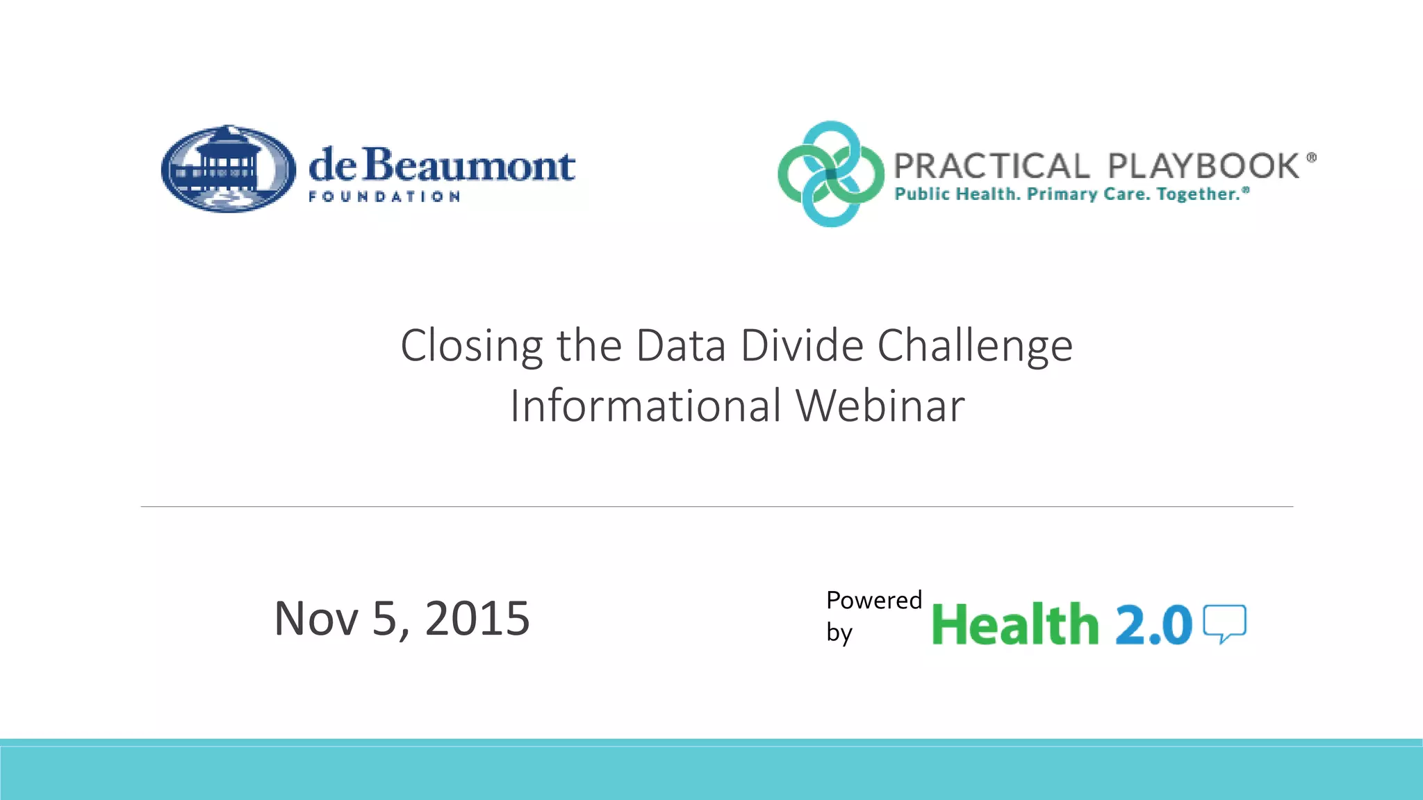 This webinar introduces the Closing the Data Divide Challenge to develop tools that facilitate data sharing between primary care and public health. The challenge is sponsored by the de Beaumont Foundation and Health 2.0. Participants are asked to submit proposals in two phases - with the first phase focusing on describing a proposed tool and the second developing a working application. Finalists in Phase I will receive $3,000 and winners in Phase II will receive prizes from $5,000 to $30,000. The goal is to create sustainable connections between primary care and public health to improve population health by leveraging their respective data and skills. Challenges to data sharing include technical infrastructure limitations and cultural barriers to collaboration that solutions should seek