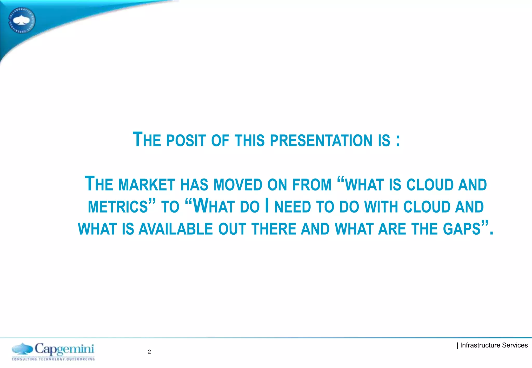 The presentation discusses various gaps that exist between the current state of cloud computing technologies and ecosystems and their potential. It identifies gaps in areas such as standards, portability, integration, security and vertical industry adoption. It argues that closing these gaps will require continued evolution of standards to improve semantics, usability, and data portability across heterogeneous cloud solutions and systems.