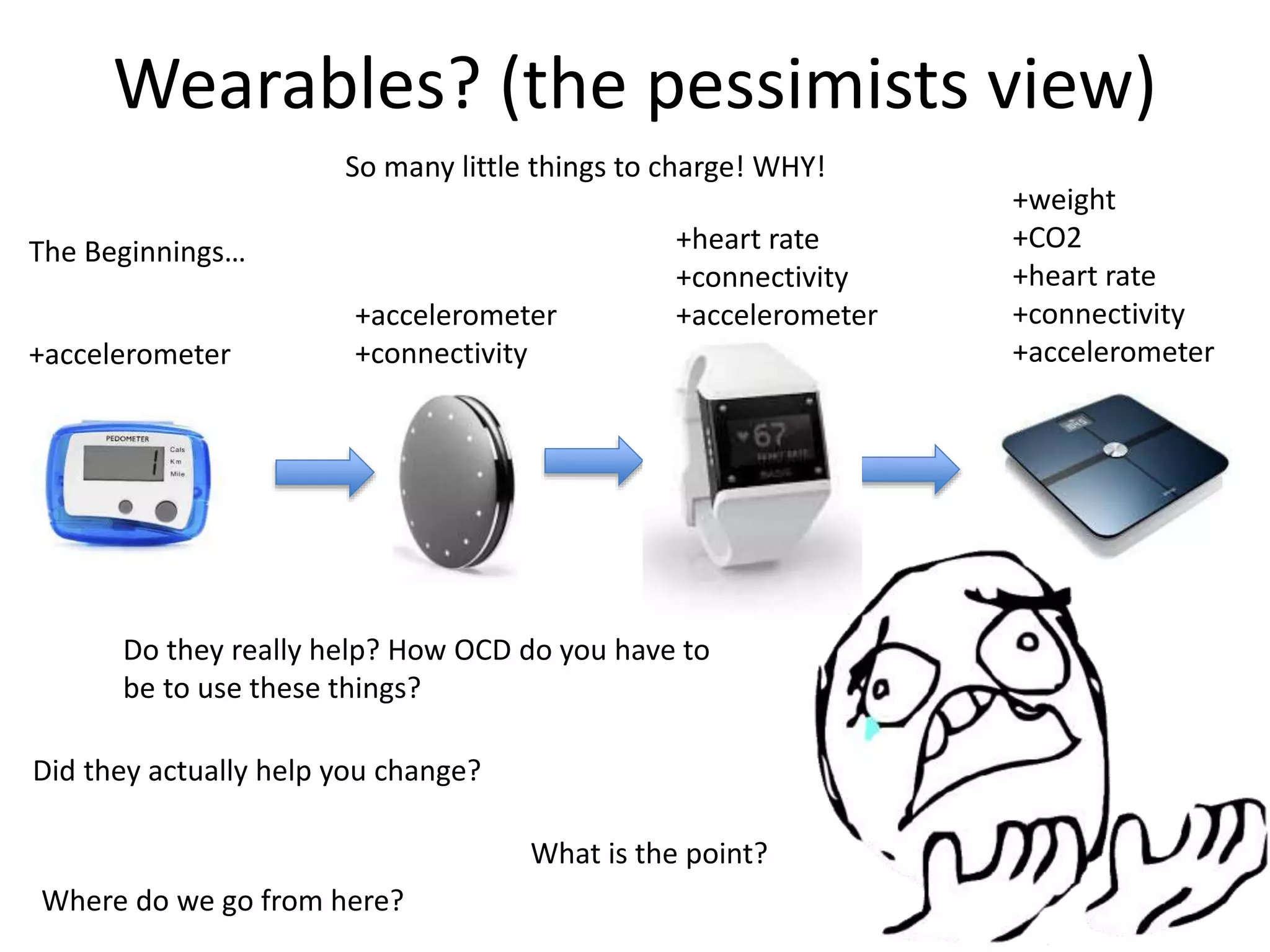 The document discusses the impact of wearable technology on personal health and behavior, presenting both pessimistic and optimistic views. While skeptics question the necessity and effectiveness of these devices, proponents argue they can enhance self-awareness and health management by simplifying human data collection. It also explores future potential advancements in health monitoring and communication through non-invasive technology.