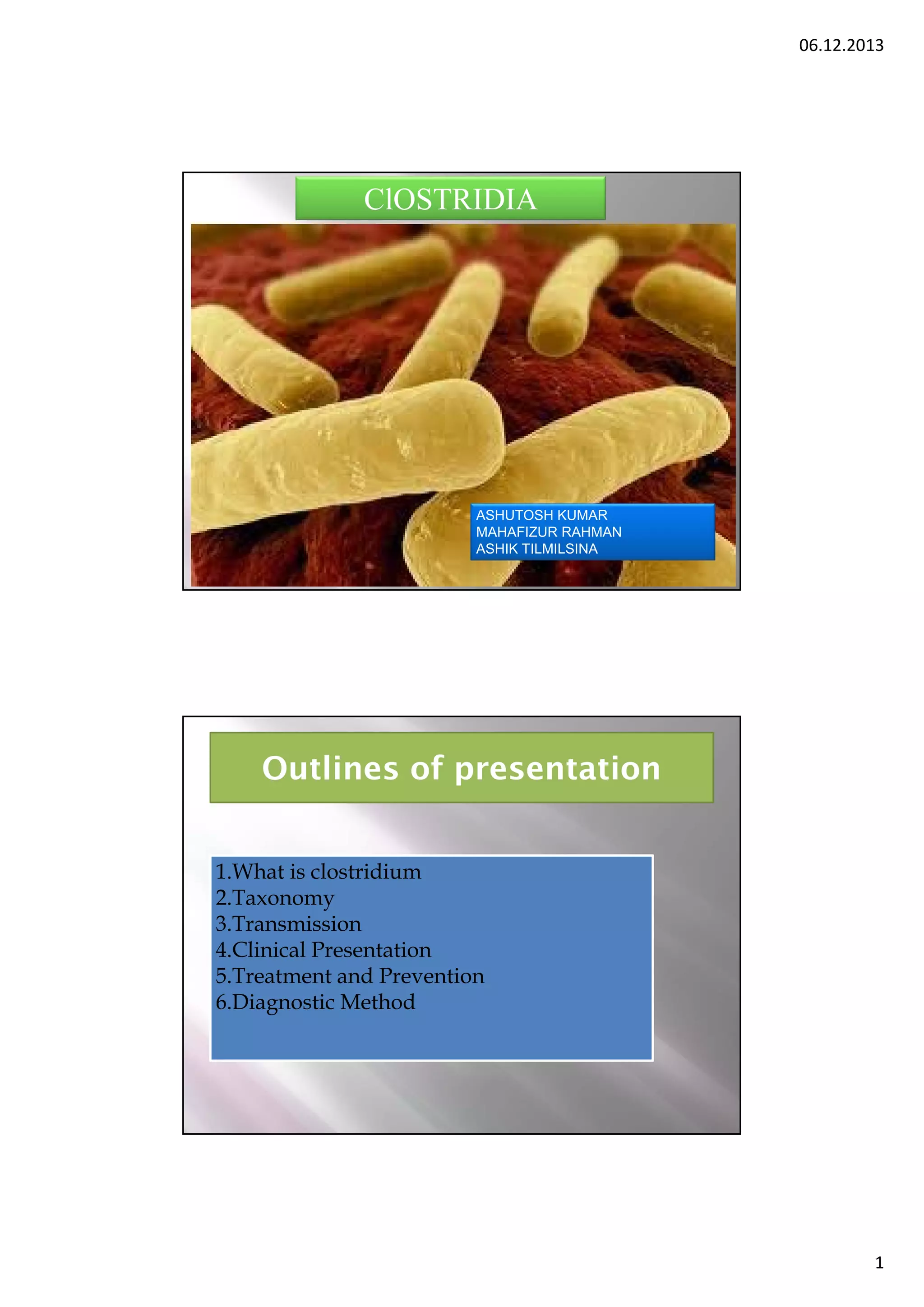 This document outlines a presentation on the genus Clostridium. It begins with an introduction to Clostridium, noting that they are gram-positive, obligate anaerobic rods that can form endospores. It then covers the taxonomy and classification of Clostridium. The document discusses several important pathogenic Clostridium species - C. botulinum, C. perfringens, C. tetani, C. difficile. For each species, it covers transmission, clinical presentation, treatment and prevention. The final section discusses various diagnostic methods for Clostridium such as culture methods, gram staining, and molecular detection techniques.