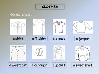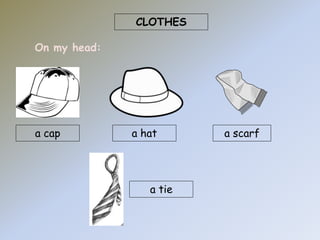 The document lists different types of clothing items categorized by where they are worn on the body, including headwear like caps and hats; tops like shirts, blouses and jackets; bottoms like skirts, trousers and shorts; full outfits like dresses and suits; footwear like boots and shoes; underwear; and jewelry.