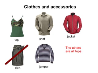 The document discusses different types of clothes and accessories. It separates items into categories such as jewelry, tops, clothes, footwear, cold weather wear, and adjectives to describe fit, pattern, color and design. Key terms used include necklace, jeans, socks, scarf, scruffy, trendy, smart, cool, nice, colorful, stripy, checked, fit, suit, and match.