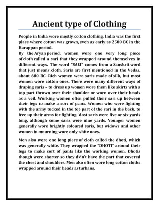 The document provides an 8-item table of contents for a book on the history of clothing in India. The topics covered include ancient clothing styles, modernizations over time with influences from other cultures, modern fashion trends, the colonial era's dress codes and related controversies, caste conflicts arising from changes in dress, Gandhi's experiments, the designing of the national dress, and a bibliography.