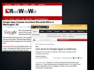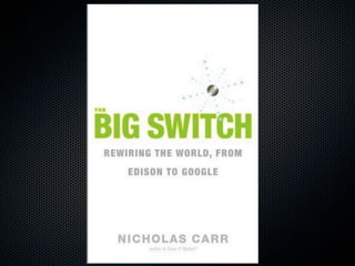 Part one discusses how cloud computing has disrupted IT by democratizing access. Part two covers the history of virtualization. Part three explains how cloud stacks separate concerns between physical infrastructure, virtual platforms, and applications. Part four frames clouds as an on-demand business model compared to traditional IT. Part five outlines the major types of cloud services including IaaS, PaaS and differences between them. Finally, part six notes that in reality, most cloud offerings blend aspects of infrastructure, platforms and software as a service.