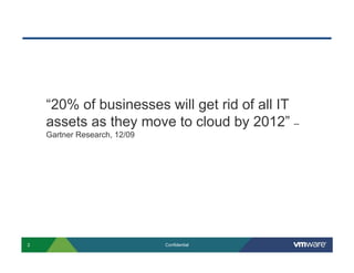 This document discusses the growing adoption of cloud computing from different perspectives. It notes that Gartner research predicts 20% of businesses will eliminate all their own IT assets by moving fully to the cloud by 2012. It also discusses how application developers, IT administrators and operators, and business advocates view and are influencing the cloud. Finally, it introduces VMware's vCloud initiatives to provide cloud solutions that can be deployed privately or publicly and integrate internal and external clouds.