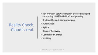 The document discusses cloud computing's impact on the software market and highlights the growing importance of security within cloud services. It emphasizes the shared responsibility model between customers and providers, the need for effective security configurations, and the role of automated tools in cloud assessments. Additionally, it includes links for job opportunities in related fields.