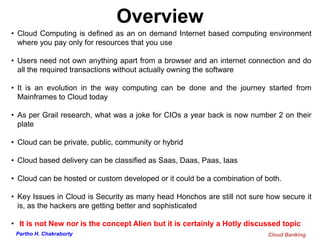 Cloud banking allows banks to provide services to customers through cloud computing. It reduces costs for banks by eliminating the need to purchase and maintain expensive on-premise software and hardware. However, security concerns remain a challenge as banks are hesitant to move customer data to the cloud. A proposed solution involves hosting bank applications through a large company like Google. This would standardize updates, integration, and access across banks while keeping customer data on-premise. Widespread adoption of cloud banking could generate significant cost savings for banks and new revenue streams for cloud hosting providers.