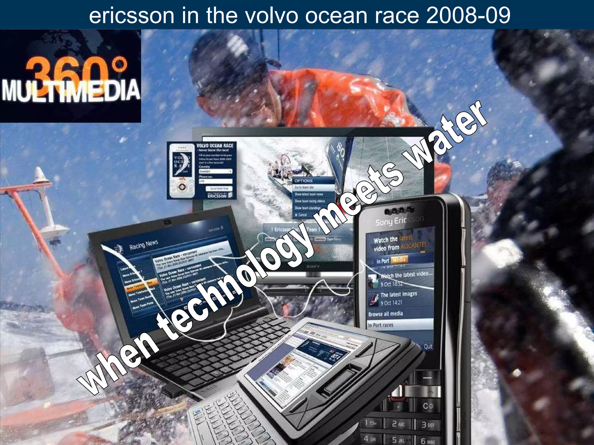 The document outlines Ericsson's involvement in the 2008-09 Volvo Ocean Race, highlighting its role in developing a cloud-based multimedia strategy for the event. Key points include the race's global reach, corporate sponsorships, and innovative digital offerings such as live TV and mobile apps for coverage. The document also emphasizes a 'rule book' for success centered on valuing people and experiences in technology-driven projects.