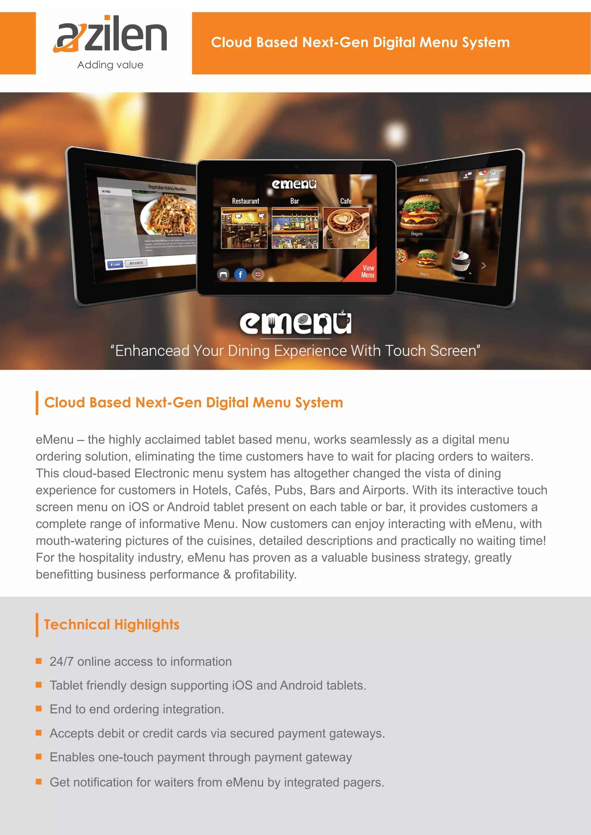 The eMenu is a cloud-based digital menu system that enhances the dining experience by allowing customers to place orders via interactive tablets, reducing wait times significantly. With features like multi-language support, a streamlined ordering process, and integrated payment solutions, it benefits both customers and the hospitality industry through improved sales and service efficiency. The system also supports centralized management for multiple operations, contributing to cost savings and increased profitability.