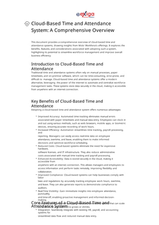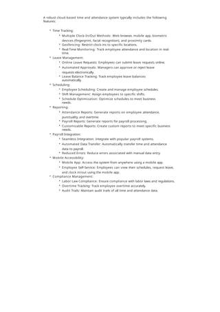 A modern, fully cloud‑powered solution enabling businesses to monitor employee attendance and working hours in real time—from any location, on web or mobile devices. It eliminates manual tracking and integrates seamlessly with payroll and HR systems. Features include biometric and GPS-based clock‑ins, shift and leave management, automated alerts for late arrivals, dashboards for attendance monitoring, and exportable, payroll-ready data