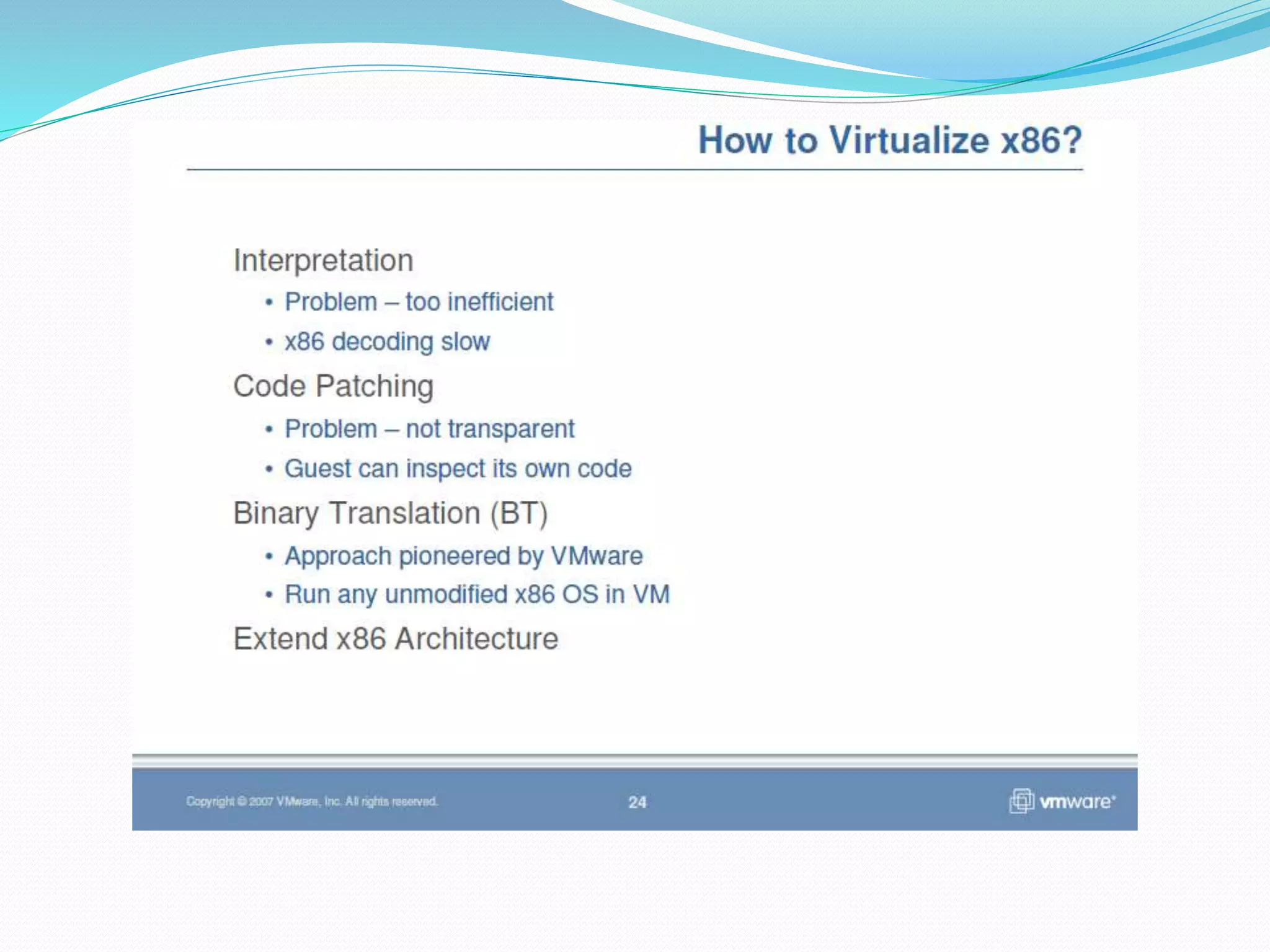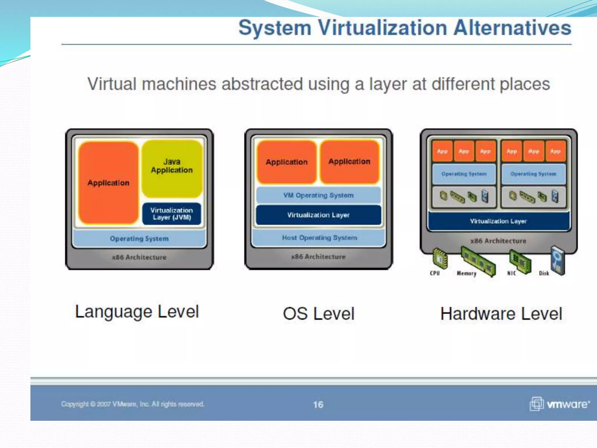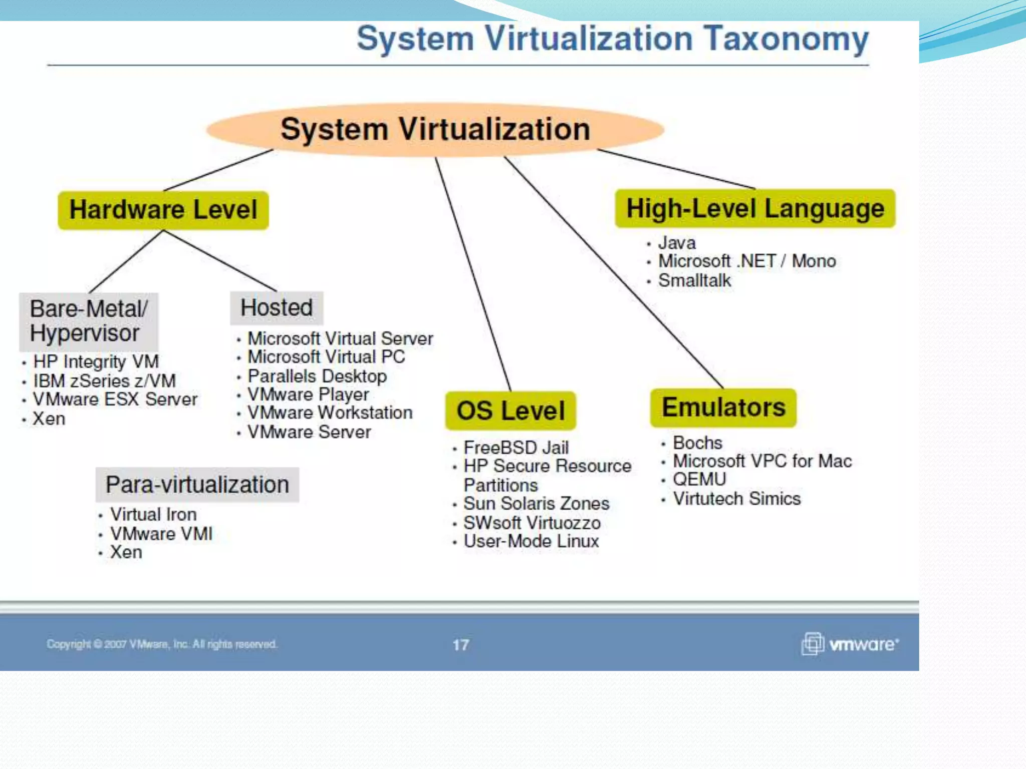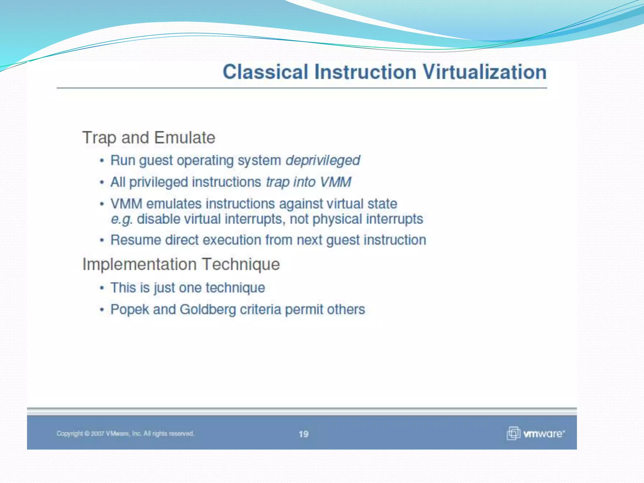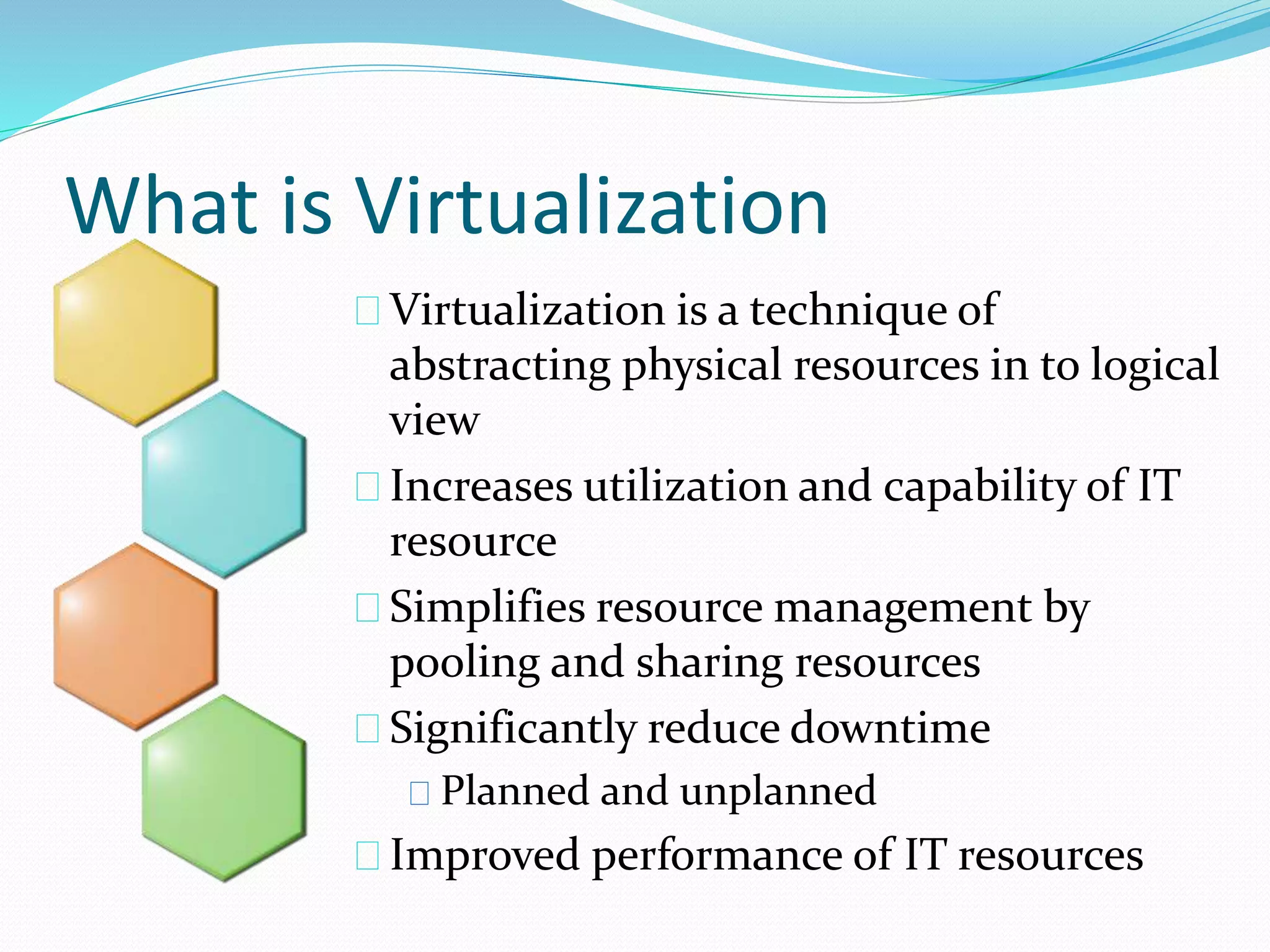 Virtualization abstracts physical computing resources into virtual resources that can be allocated dynamically. It allows for server consolidation, improved system management, increased application availability, and more efficient use of resources. There are different types of virtualization including server, storage, and network virtualization. Server virtualization uses a virtual machine monitor to run multiple virtual machines on a single physical machine. Storage virtualization presents a logical view of physical storage to improve utilization and manageability. Trap-and-emulate is a common approach for virtualizing the system instruction set architecture by having privileged instructions trap to an emulator.