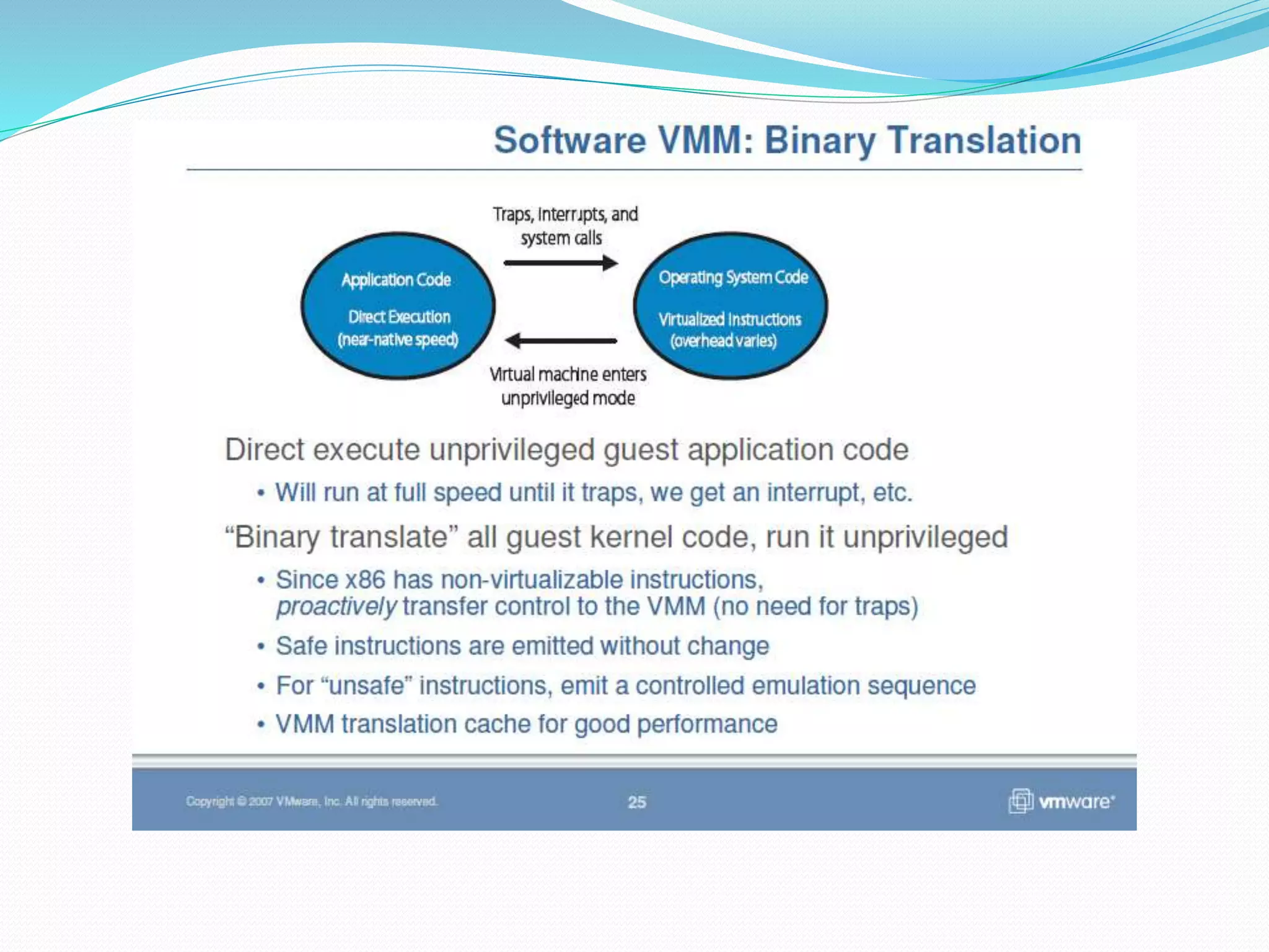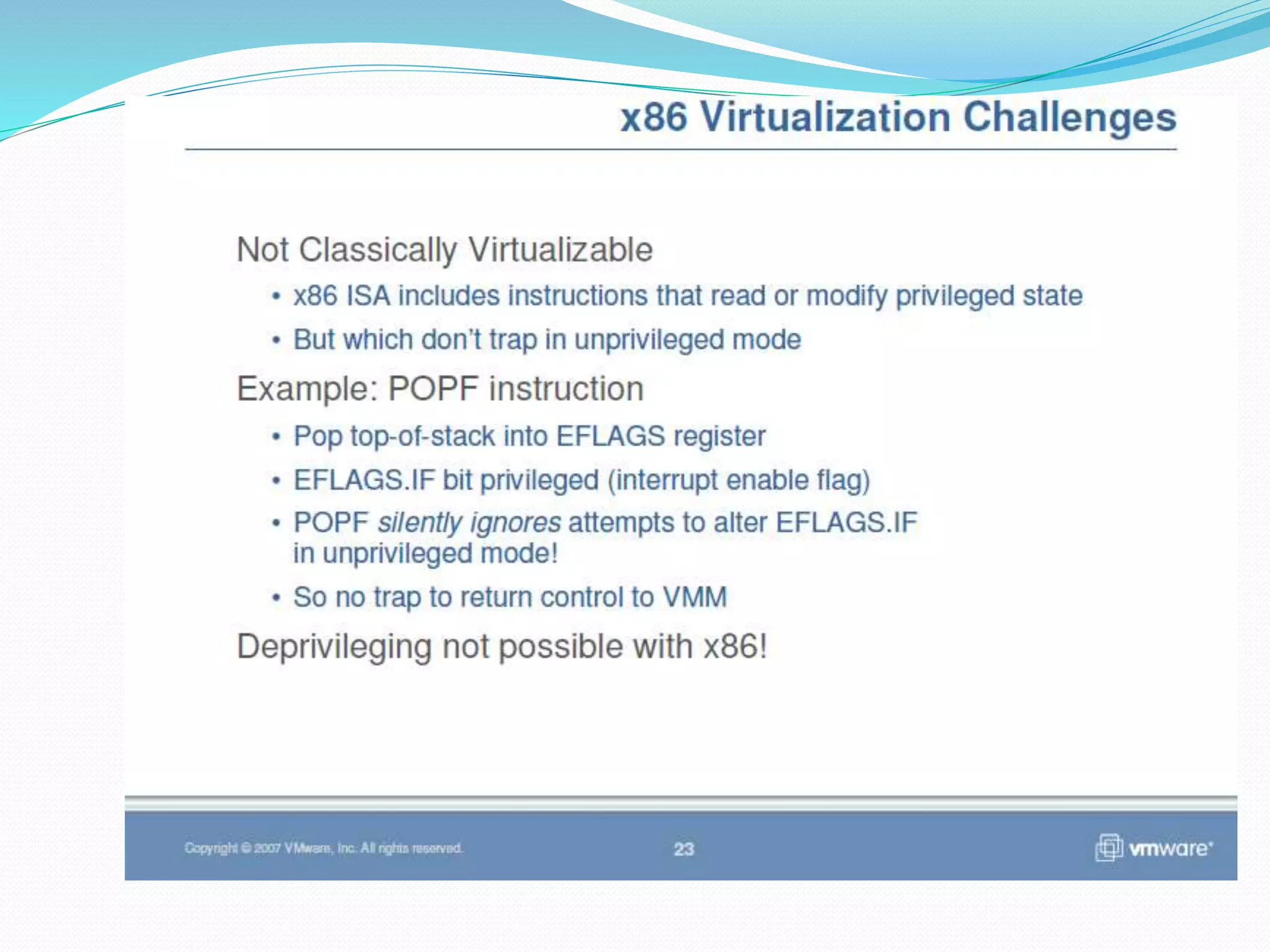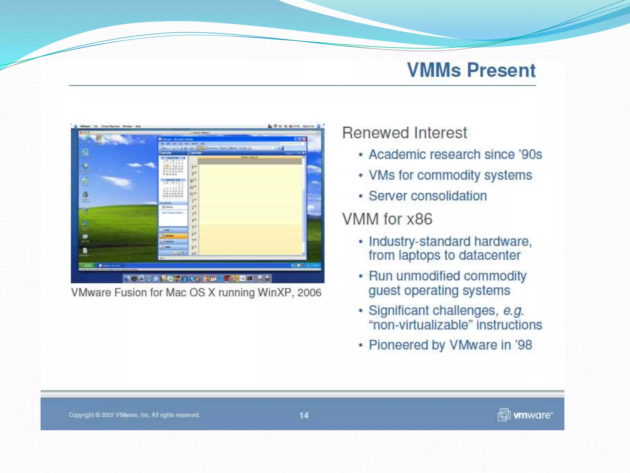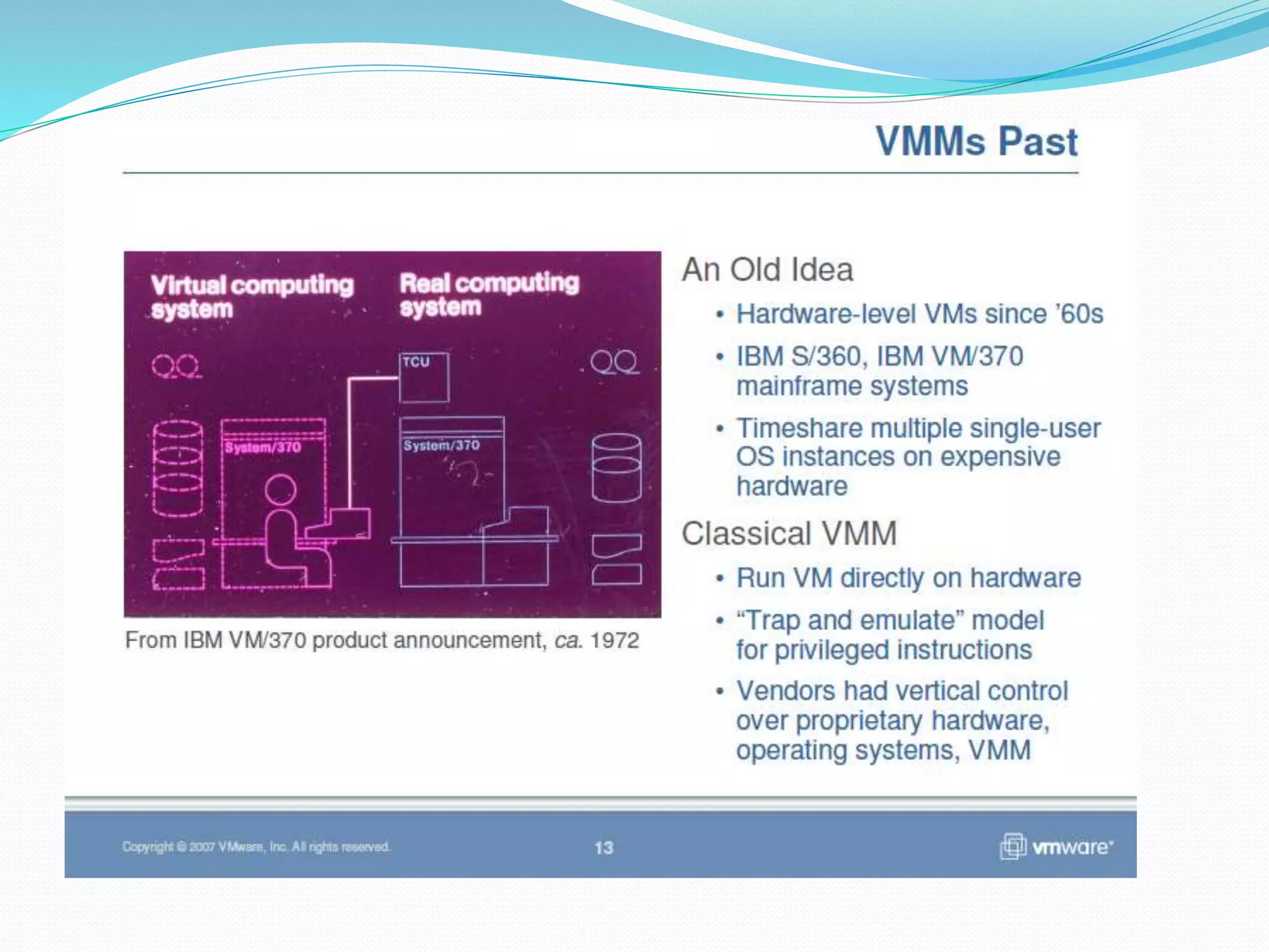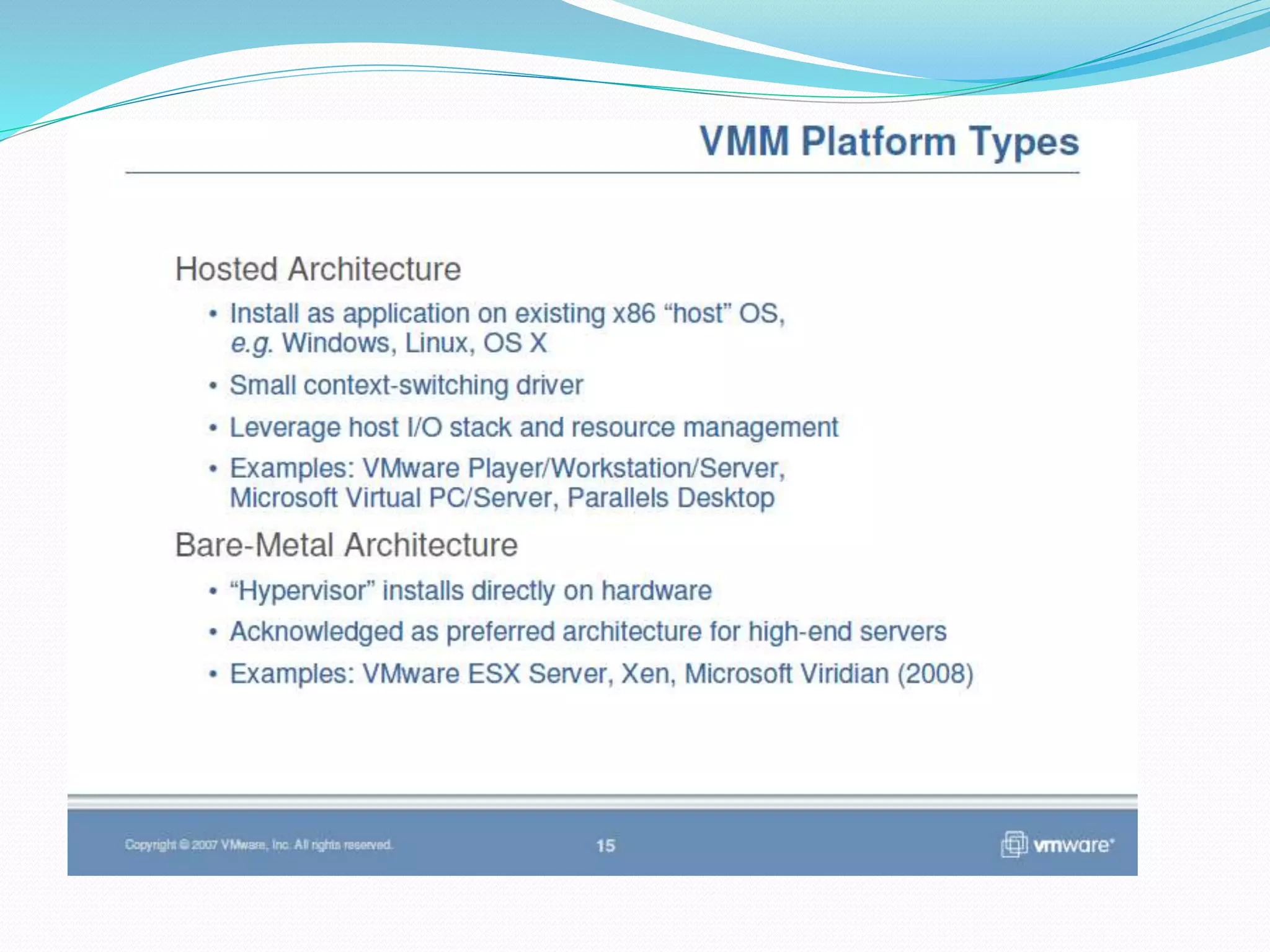 Virtualization abstracts physical computing resources into virtual resources that can be allocated dynamically. It allows for server consolidation, improved system management, increased application availability, and more efficient use of resources. There are different types of virtualization including server, storage, and network virtualization. Server virtualization uses a virtual machine monitor to run multiple virtual machines on a single physical machine. Storage virtualization presents a logical view of physical storage to improve utilization and manageability. Trap-and-emulate is a common approach for virtualizing the system instruction set architecture by having privileged instructions trap to an emulator.