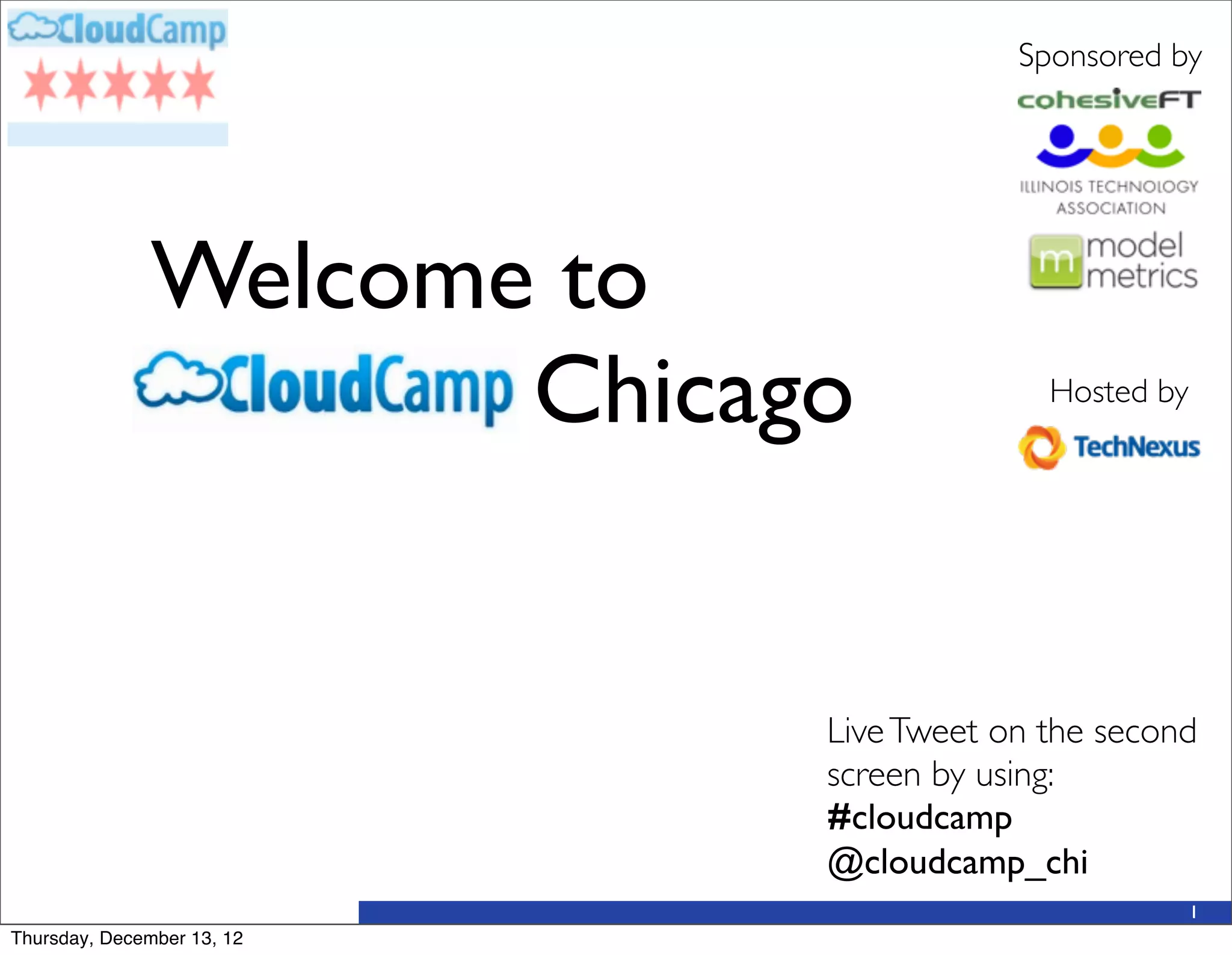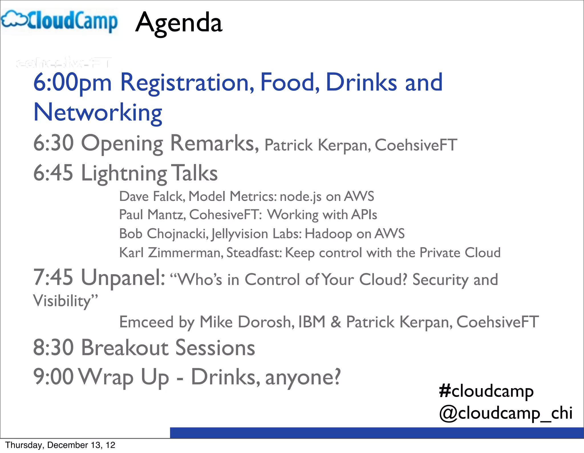 The document outlines the agenda for CloudCamp Chicago held on December 13, 2012, featuring various speakers discussing topics such as Node.js on AWS, APIs in cloud environments, big data with Hadoop, and managing private clouds. Each speaker highlighted the benefits and challenges related to their subjects, advocating for tools like Node.js and Hadoop for scalable applications and data analysis. Additionally, an unpanel discussion focused on cloud security and visibility concerns in relation to control over cloud services.