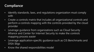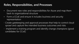 The document provides various resources for cloud adoption and security, including links to Microsoft's Cloud Adoption Framework and guidance on establishing a Cloud Center of Excellence. It features educational materials from platforms like Microsoft Learn and A Cloud Guru, along with security benchmarks from the Cloud Security Alliance and CIS. These resources aim to assist organizations in effectively navigating cloud adoption and enhancing their cloud security posture.