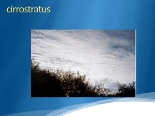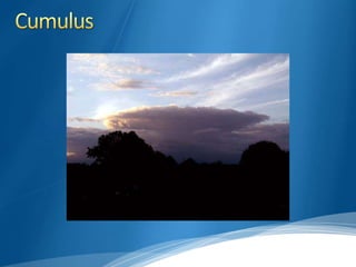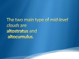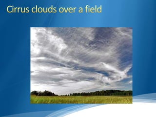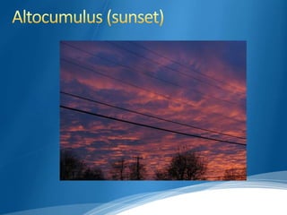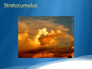 This document discusses cloud classification and describes the different types of clouds. It begins by explaining the Latin prefixes used to classify clouds by altitude, such as "cirro-" for high-level clouds above 20,000 feet composed of ice crystals. Mid-level clouds between 6,500 and 20,000 feet use the prefix "alto-", and can contain water, ice, or a mix. Low clouds below 6,500 feet do not use a prefix. The document then describes the main types of high, mid, and low clouds such as cirrus, altostratus, stratocumulus, and cumulonimbus clouds. It explains the characteristic appearances and formations of each cloud type.