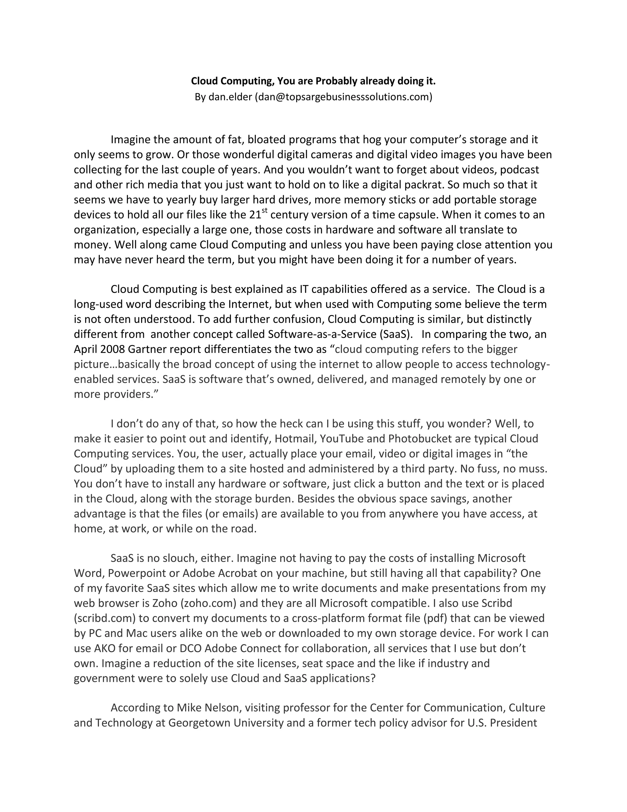 Cloud computing allows users to access technology-enabled services via the internet, reducing the need for extensive hardware and software. Examples include services like Hotmail and YouTube, which provide storage and functionality without the burden of installations. As cloud computing and software-as-a-service (SaaS) continue to grow, they promise efficiency gains for organizations while raising important concerns about data privacy and security.