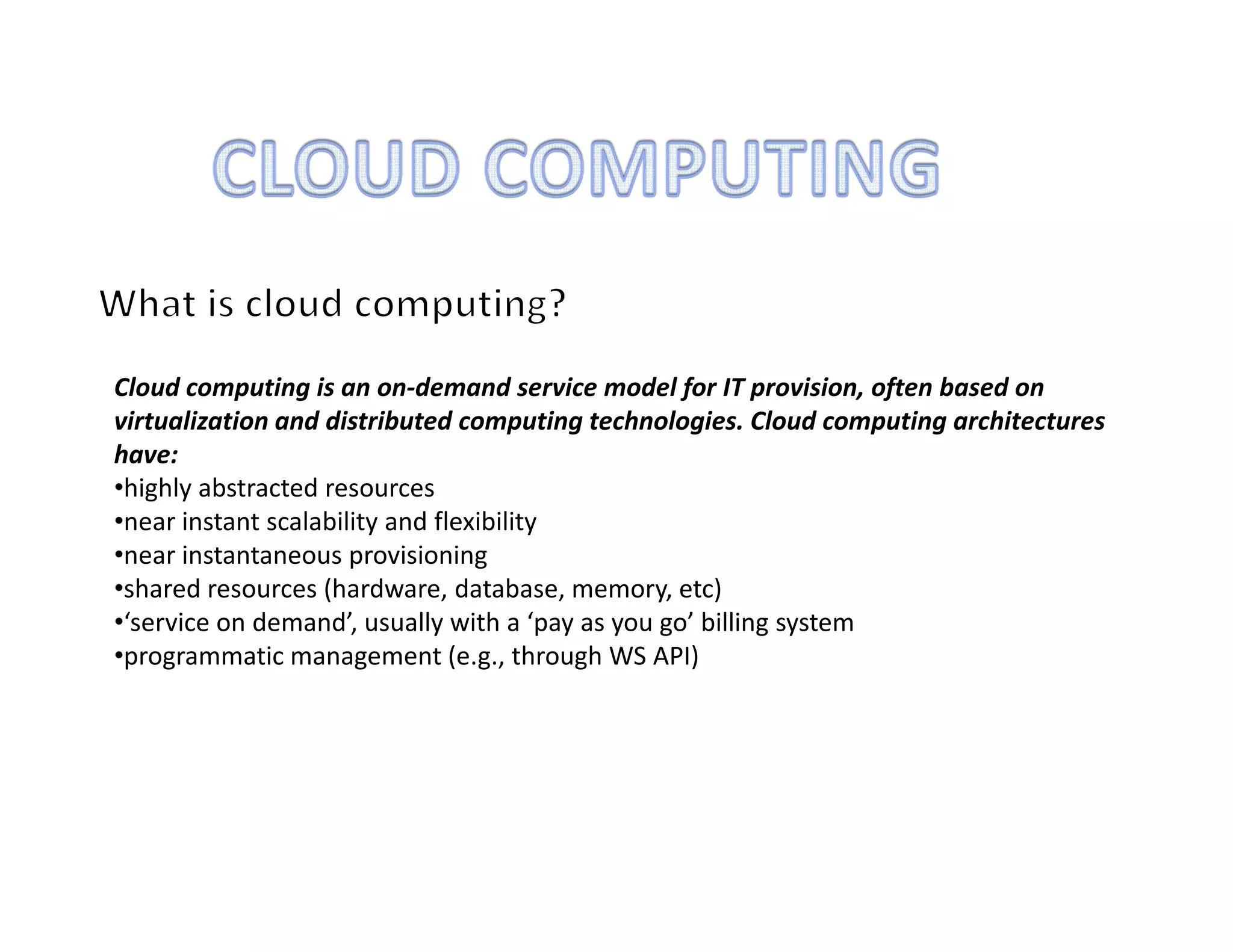 Cloud computing is an on-demand service model that provides scalable and flexible IT resources over the Internet. Key attributes of cloud computing include pooled computing resources through virtualization, elastic scaling, flexible pricing where users pay only for resources used, and resources provided as a service. Cloud services are broadly divided into Infrastructure as a Service (IaaS), Platform as a Service (PaaS), and Software as a Service (SaaS). IaaS provides basic storage and computing resources, PaaS provides software development tools and runtimes, and SaaS provides complete applications to end users over the Internet.