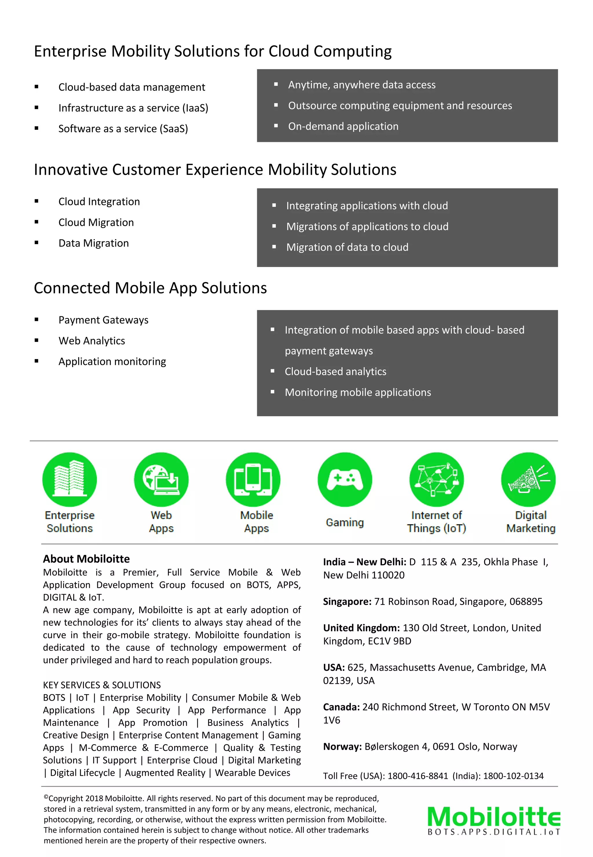 Mobiloitte specializes in cloud computing solutions, anticipating the sector's revenue to exceed $200 billion in 2016 with a notable rise in hybrid cloud adoption. The company addresses various industry challenges by focusing on mobile and web application development, cloud integration, and operational responsiveness. Key services include cloud-based data management, IaaS, SaaS, and innovative mobility solutions to enhance customer experiences.