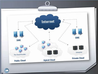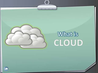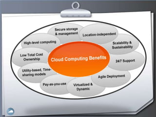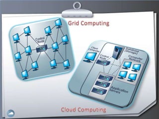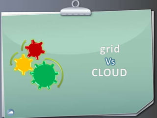 1. The document discusses cloud computing and compares it to grid computing. Cloud computing delivers computing as a service using virtualized hardware and software platforms.