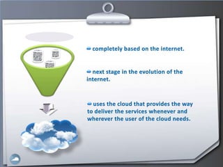2. Cloud computing provides massive scalability, fault tolerance, and reliable service quality through virtualization and load balancing across infrastructure.