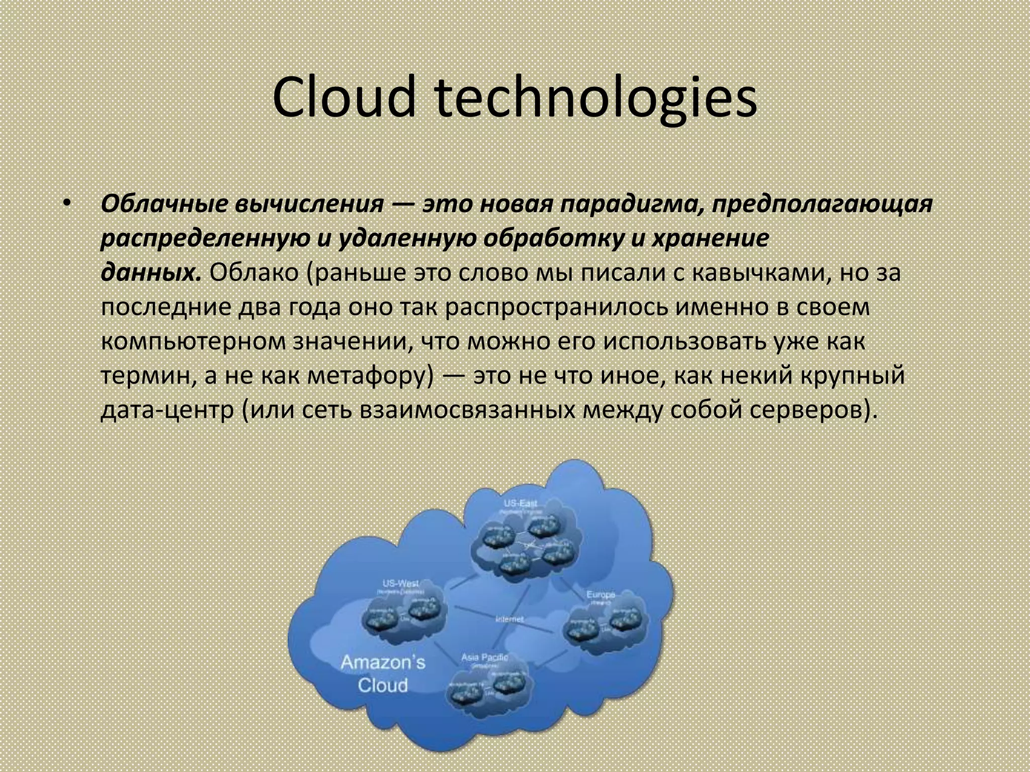 Документ описывает облачные вычисления как распределённую обработку и хранение данных в крупных дата-центрах и сетях серверов. Он также рассматривает архитектуру и функциональность систем, включая услуги Amazon и их интеграцию с приложением проверки правописания. В дополнение, упоминается структура хранения данных и важные процессы, такие как актуализация и извлечение данных.