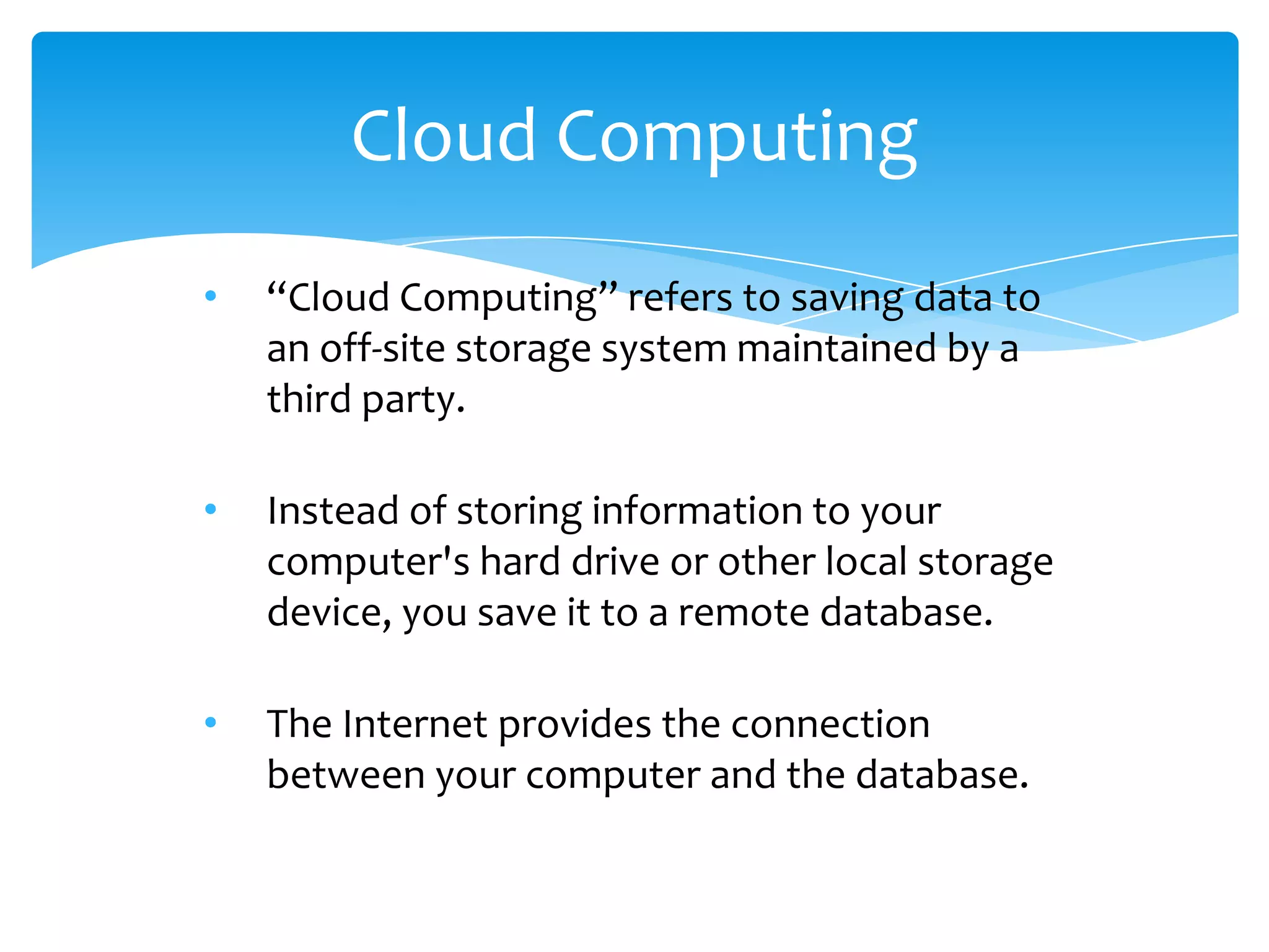 Cloud computing refers to storing and accessing data and programs over the Internet instead of a computer's hard drive. It allows access to data from any location, collaboration, and relies on encryption and authentication for security. Popular cloud storage systems include Dropbox, Google Drive, OneDrive, iCloud, and Amazon Drive.