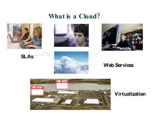 The document discusses cloud computing, including definitions, key characteristics, components, roles, and implementations. It defines cloud computing as using web-based tools and storing information on remote servers operated by another company. Key characteristics include scalability, multi-tenancy, pay-per-use pricing, and device/location independence. The main components are infrastructure, storage, platforms, applications, services, and clients. Implementations discussed include the Virtual Computing Laboratory and Amazon EC2.