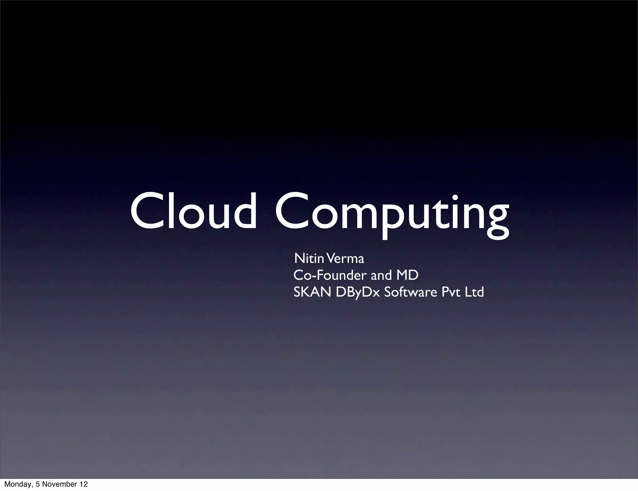 The document defines cloud computing as using computing resources delivered over a network, typically the internet. It discusses the main types of cloud services: Software as a Service (SaaS), Platform as a Service (PaaS), and Infrastructure as a Service (IaaS). The cloud offers benefits like elastic scaling, pay-as-you-go pricing and no upfront investment. However, challenges include privacy, security, reliability and compliance.