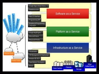 This document defines cloud computing and discusses its key technologies. It begins by defining cloud computing as the delivery of computing resources over a network. It then explains the three main cloud computing models: Infrastructure as a Service (IaaS), Platform as a Service (PaaS), and Software as a Service (SaaS). The document also discusses cloud computing types, related technologies like virtualization, and the pros and cons of cloud computing.