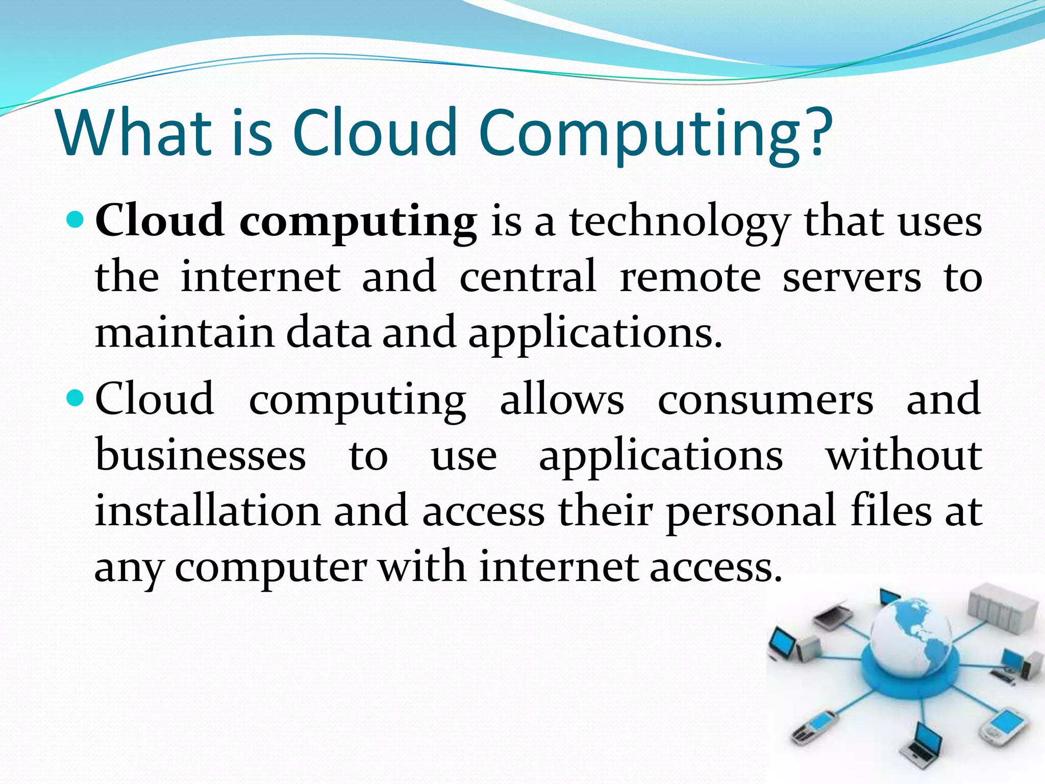 Cloud computing allows users to access applications and files from any device with an internet connection. It provides computation resources, software, data access, and storage through remote servers rather than local hardware. There are different types of cloud deployment models including public, private, hybrid, and community clouds that are distinguished by their intended user base. The cloud architecture consists of a front-end interface and back-end servers that host applications and store data.