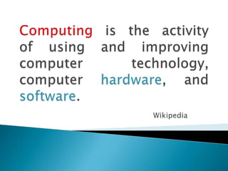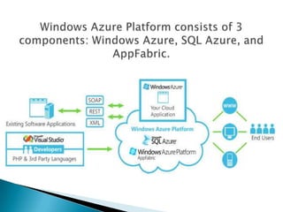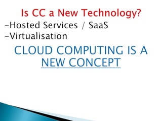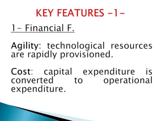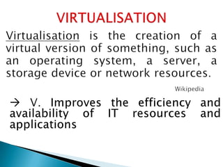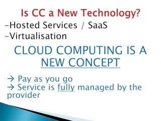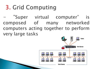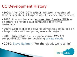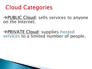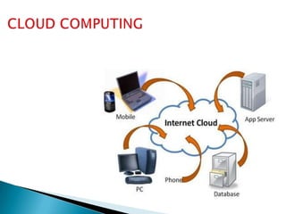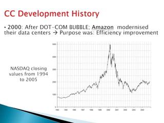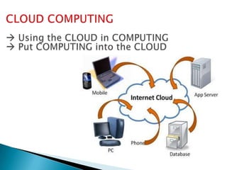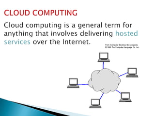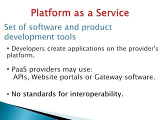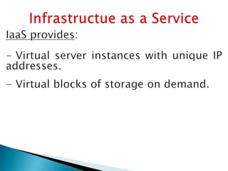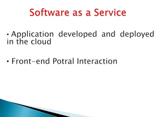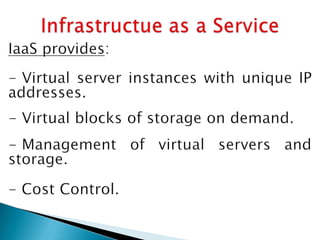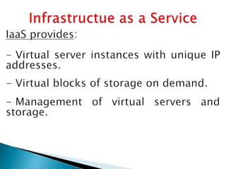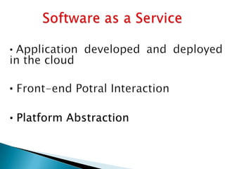 The document discusses the different layers of cloud computing services. At the lowest level are the physical resources like computers, networks, and transmission means. Above this is the infrastructure layer which provides virtual server instances, storage, and management. Next is the platform layer which offers development tools and middleware/OS services. The highest layer is software as a service which provides full abstracted applications to end users.