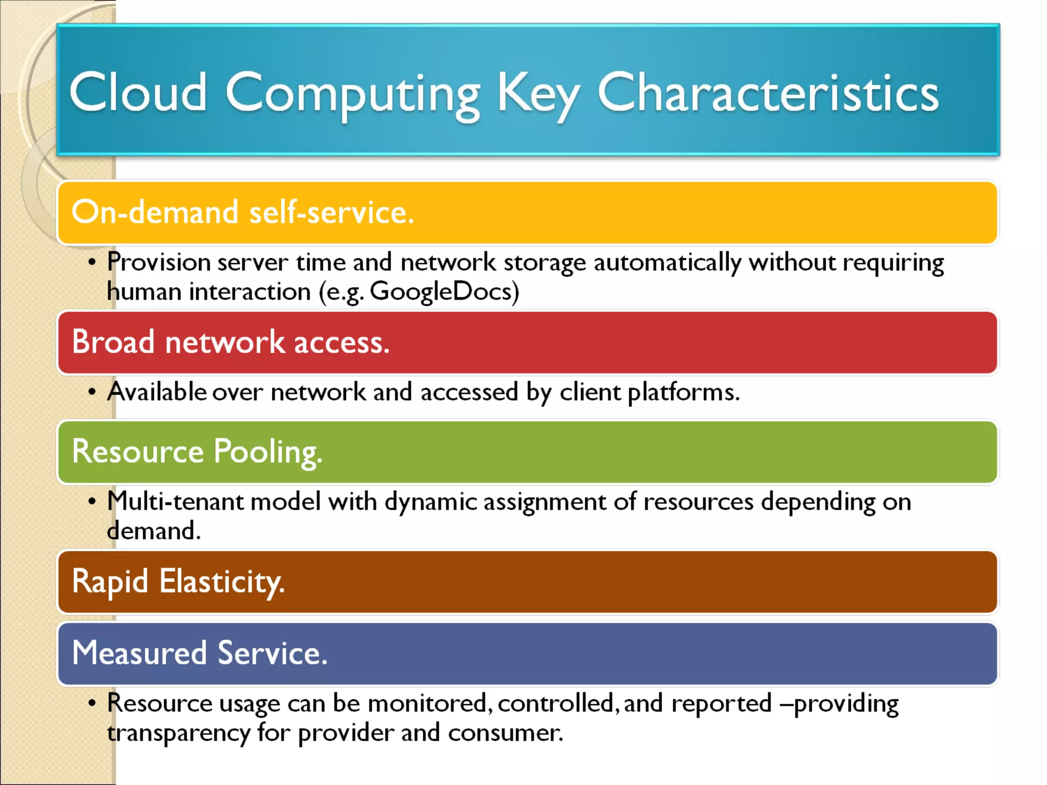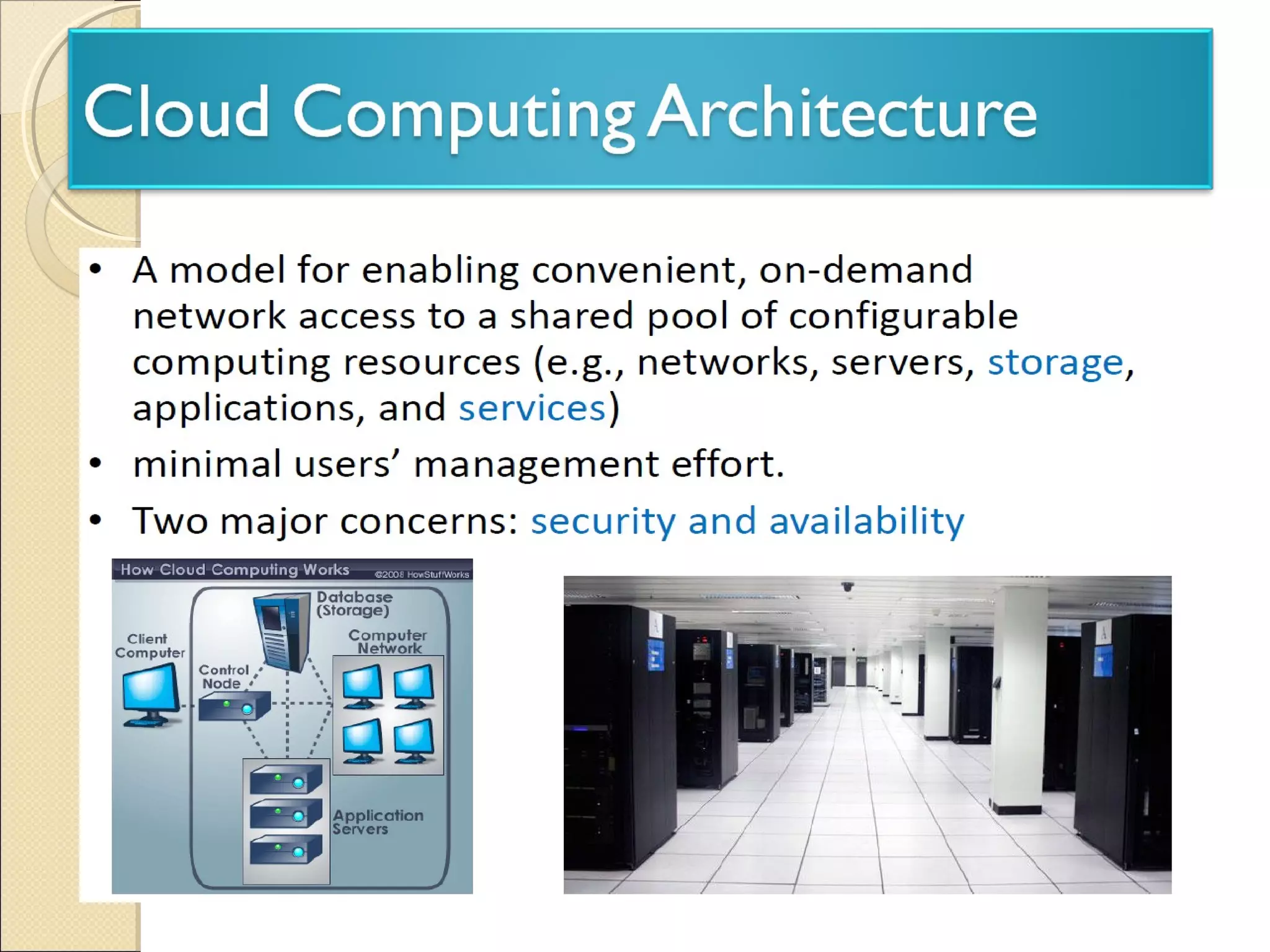 Cloud computing allows for on-demand access to shared computing resources like networks, servers, storage, applications and services. It provides accessibility, agility and flexibility through rapid provisioning and releasing of resources with minimal management effort. Some key aspects of cloud computing include virtualization, multi-tenancy, broad network access, resource pooling and measured service. Cloud computing is changing the nature of IT by moving computing resources from local desktops and data centers to the internet.