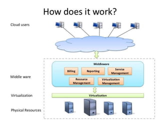 Cloud computing is the on-demand delivery of IT resources and applications via the Internet with pay-as-you-go pricing. The presentation discusses the history of cloud computing starting in 1999 with Salesforce.com pioneering software-as-a-service, followed by expansions from Microsoft, IBM, Amazon, Google and others. It also covers the key characteristics like scalability, elasticity, and pay-per-use model, as well as the layers of cloud computing infrastructure, platform and software as a service and the advantages of lower costs and flexibility along with disadvantages of security and privacy concerns.