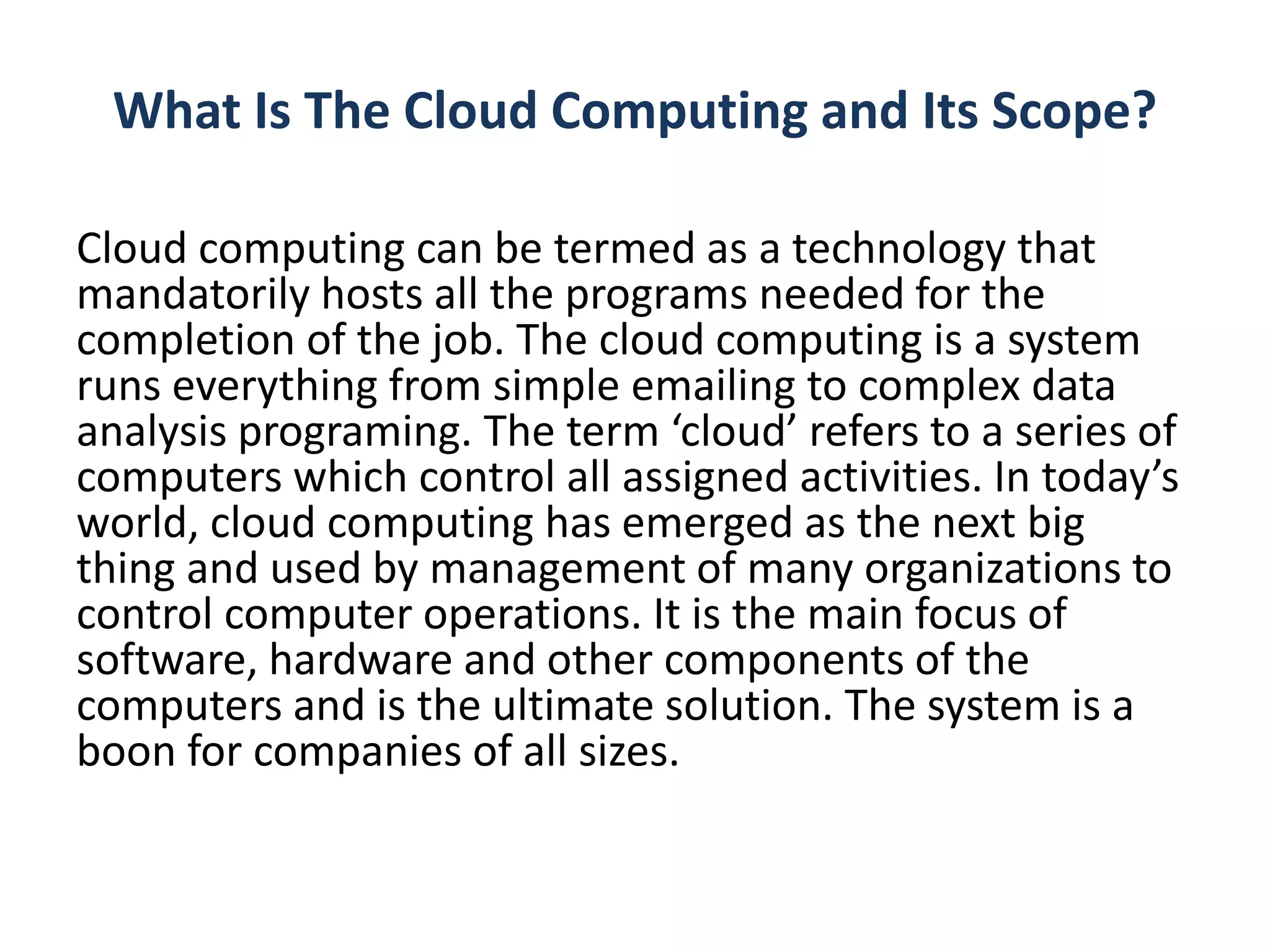 Cloud computing is a technology that allows programs and services to be delivered over the Internet. It allows everything from email to complex data analysis programs to be hosted remotely on servers that make up the "cloud." Organizations use cloud computing to manage computer operations and resources more efficiently. All that is needed to access cloud services is a computer, web browser, and Internet connection. Cloud computing provides quick solutions and has become essential for many organizations. It reduces costs associated with software, hardware, and data center maintenance.