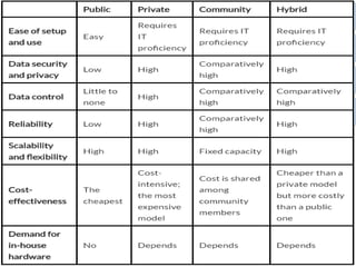 The document provides an overview of cloud computing, describing it as a network of remote servers that deliver various services via the internet, including data storage and software. It outlines different cloud deployment models (public, private, community, hybrid) and service models (SaaS, PaaS, IaaS), emphasizing their unique features and benefits. Additionally, it discusses the advantages, such as accessibility and cost-effectiveness, as well as disadvantages like potential loss of control and bandwidth issues associated with cloud computing.