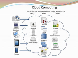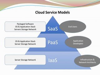 Cloud computing allows users to access computer resources and applications remotely through the internet. There are three main types of cloud computing models: Infrastructure as a Service (IaaS), Platform as a Service (PaaS), and Software as a Service (SaaS). IaaS provides remote access to computing infrastructure resources like storage and servers. PaaS allows users to deploy their own applications using tools supported by the cloud provider. SaaS delivers applications to users through a web browser or program interface without requiring downloads or installation. Cloud computing provides advantages like cost efficiency, high speed, accessibility from anywhere, and easy data backup and recovery, but also poses risks such as security issues, low bandwidth, lack of flexibility, and