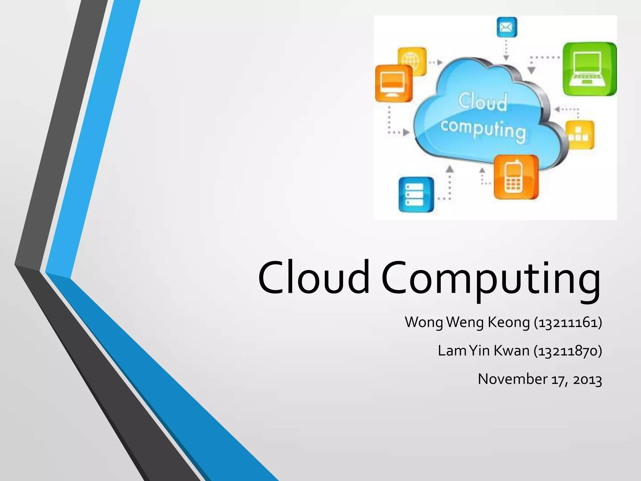 This document summarizes a project on cloud computing. It divides the tasks between two members: Lam Yin Kwan covered the project background, survey and data processing, and conclusion, while Wong Weng Keong focused on data analysis, multimedia content, and PowerPoint design. The document then provides background on the history of cloud computing and defines it as internet-based services and resources. It describes the different types of clouds and models of cloud services. It also summarizes the results of an online survey on cloud computing use and perceptions. Finally, it discusses the positives and negatives of cloud computing.