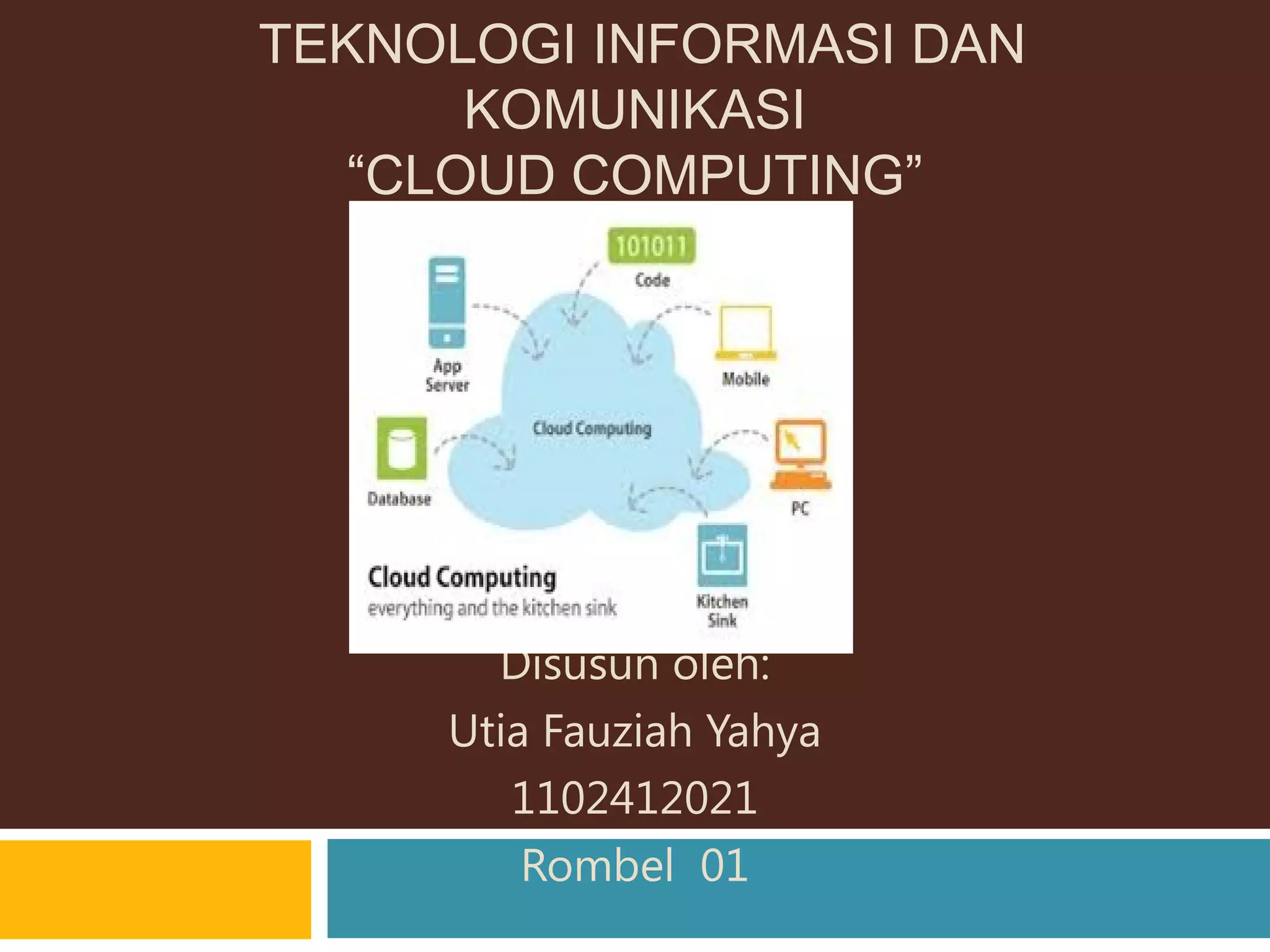 Dokumen tersebut membahas tentang Cloud Computing, mulai dari definisi, sejarah perkembangannya, karakteristik, manfaat, dan contoh penerapan. Definisi Cloud Computing adalah gabungan antara pemanfaatan teknologi komputer dan pengembangan berbasis Internet dimana informasi tersimpan di server internet dan sementara di perangkat pengguna. Sejarahnya dimulai dari era paradigma baru dengan ASP hingga era Cloud Computing saat ini. Karakteristiknya meliputi on
