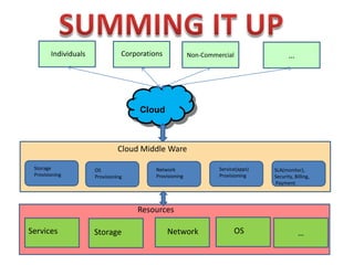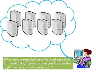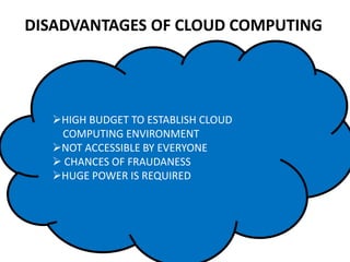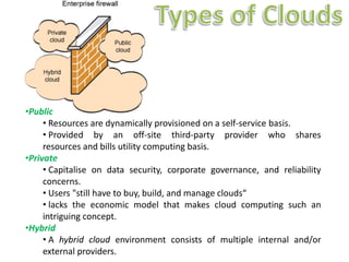 This document defines cloud computing and outlines its key characteristics. Cloud computing provides on-demand access to shared computing resources like networks, servers, storage, applications and services over the internet. Users can access these resources from anywhere without needing to manage the physical infrastructure. The cloud offers advantages like flexibility, scalability, device independence and reduced costs compared to maintaining physical servers. However, security, vendor lock-in and reliance on a stable internet connection are challenges to cloud computing adoption.