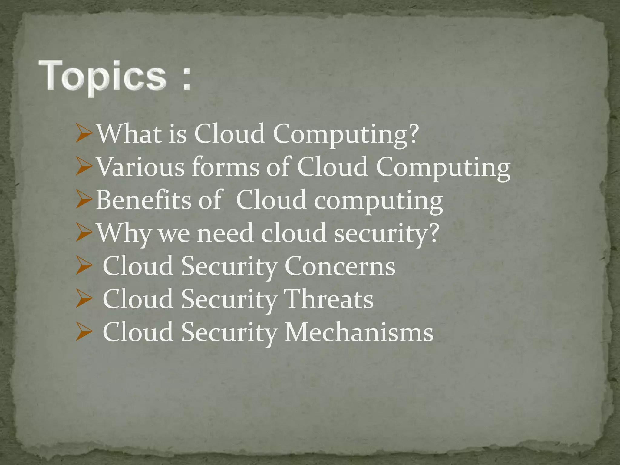 This document discusses cloud security. It begins by defining cloud computing and its various forms. It then discusses the benefits of cloud computing and why cloud security is needed. The document outlines common cloud security concerns like multitenancy, velocity of attacks, information assurance and data privacy. It also describes threats to cloud security such as VM theft, hyperjacking, data leakage and denial-of-service attacks. Finally, it discusses various cloud security mechanisms for securing systems, data, identities and performing risk analysis.