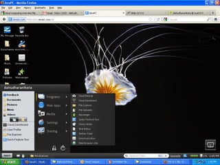 The document discusses cloud computing, including its history, types of cloud services (SaaS, PaaS, IaaS), examples of cloud platforms, types of cloud deployments (public, private, hybrid cloud), cloud operating systems, data centers, and disadvantages of cloud computing such as reliance on internet connectivity.