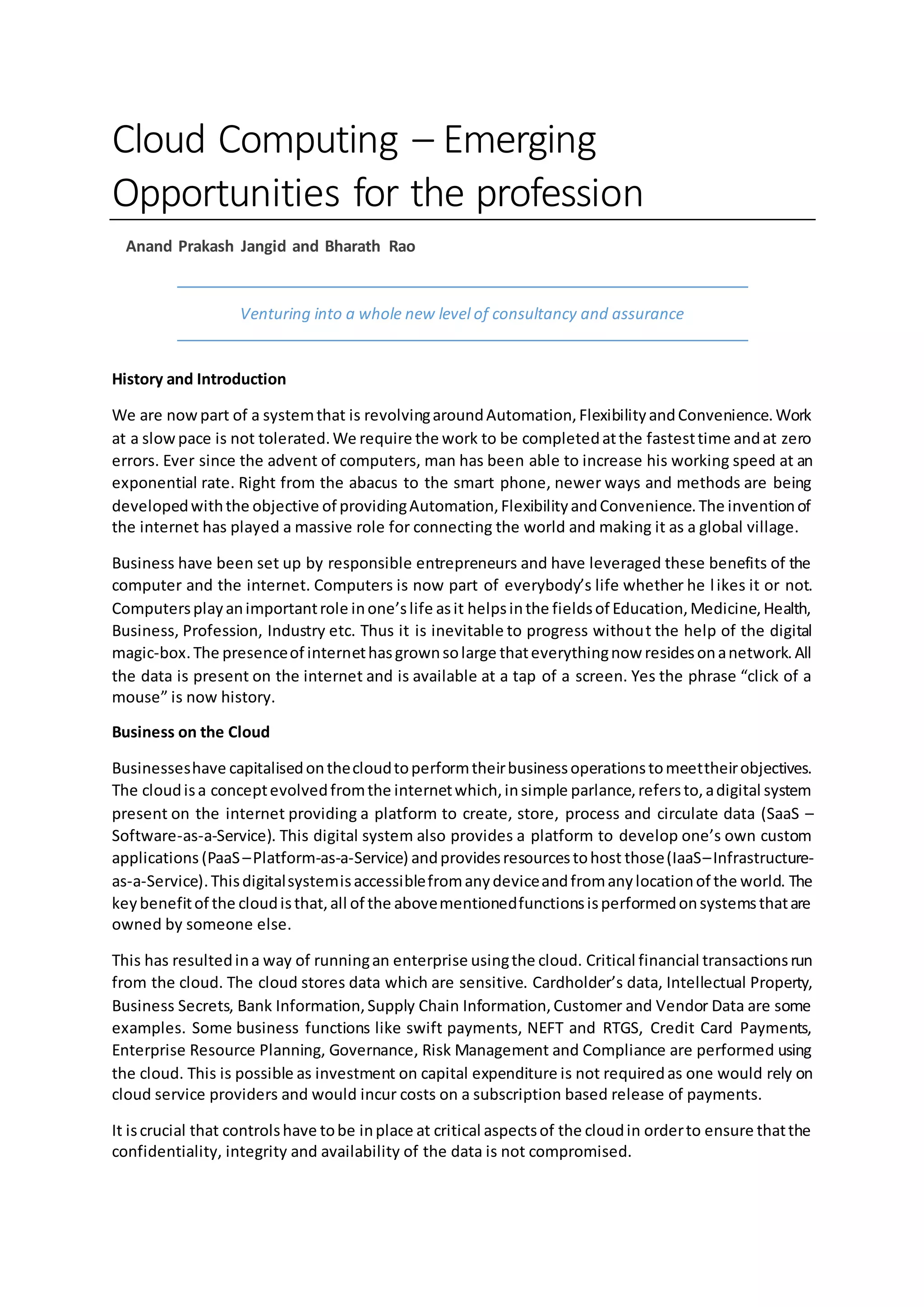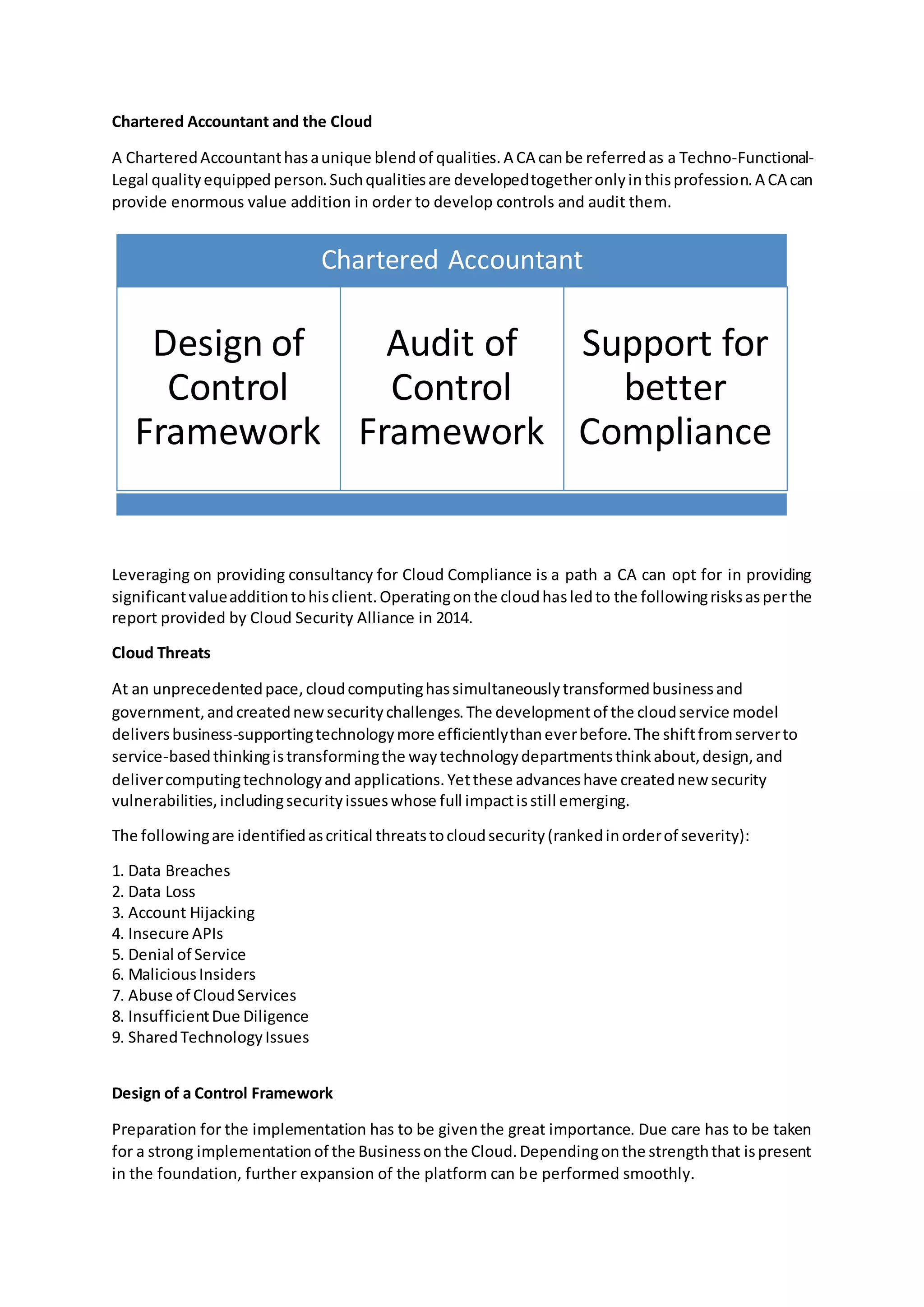 The document discusses the transformative impact of cloud computing on businesses and the role of chartered accountants in shaping and auditing cloud-based operations. It emphasizes the importance of implementing robust control frameworks to safeguard data and ensure compliance with various regulations. The document also highlights the emerging risks associated with cloud computing and positions chartered accountants as key players in providing value-added consultancy and assurance in this evolving landscape.