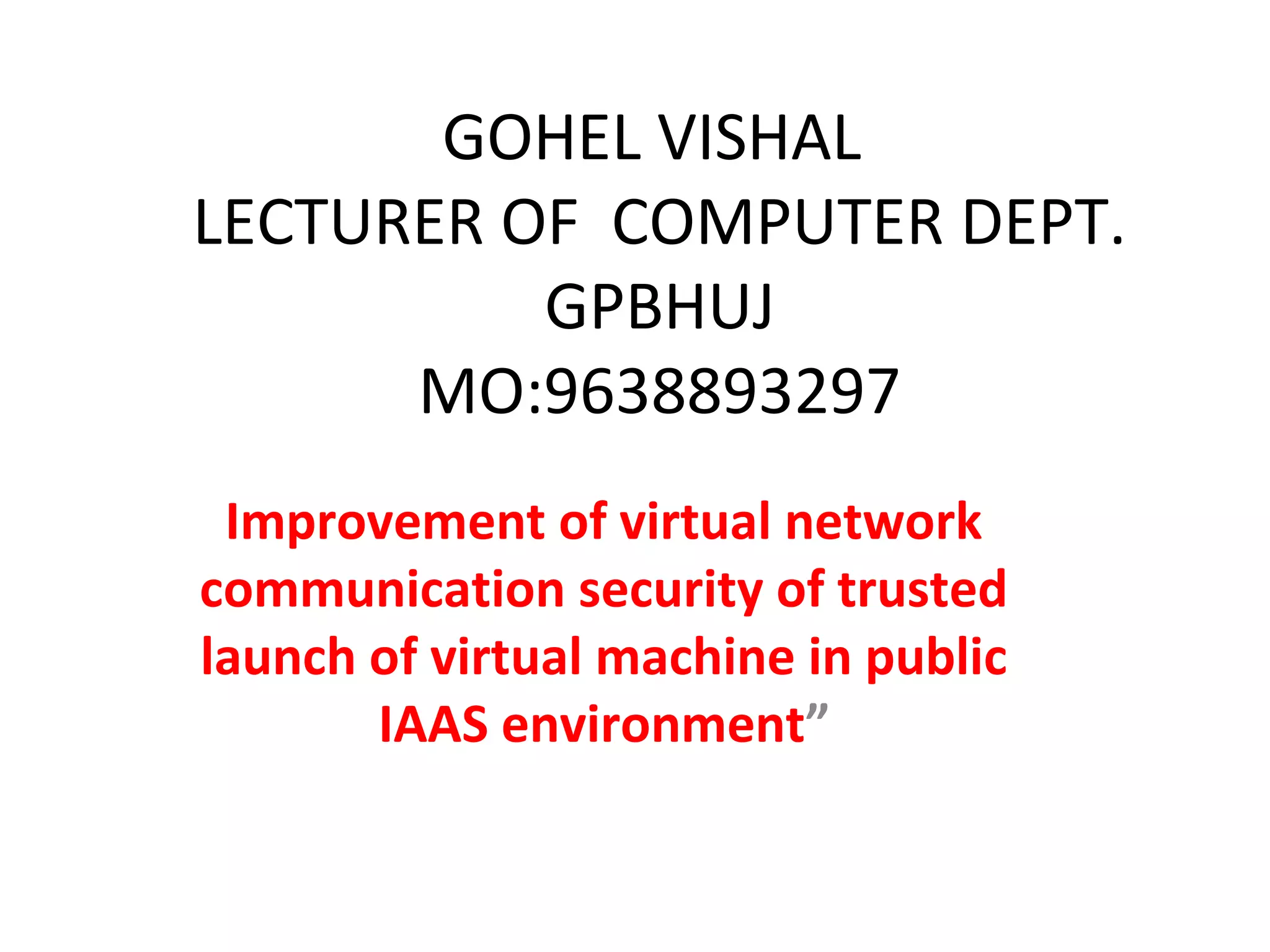 Vishal Gohel proposes improving the security of virtual network communication and trusted launch of virtual machines in public infrastructure as a service (IAAS) environments. He plans to implement a secure runtime environment using the Xen hypervisor and demonstrate how it can enable secure remote computing services even under an untrusted management operating system. The expected outcomes are a secure network interface, comparison of different hypervisors for trusted virtual network communication, and the creation of a trusted computing environment for virtual machines requiring high security.