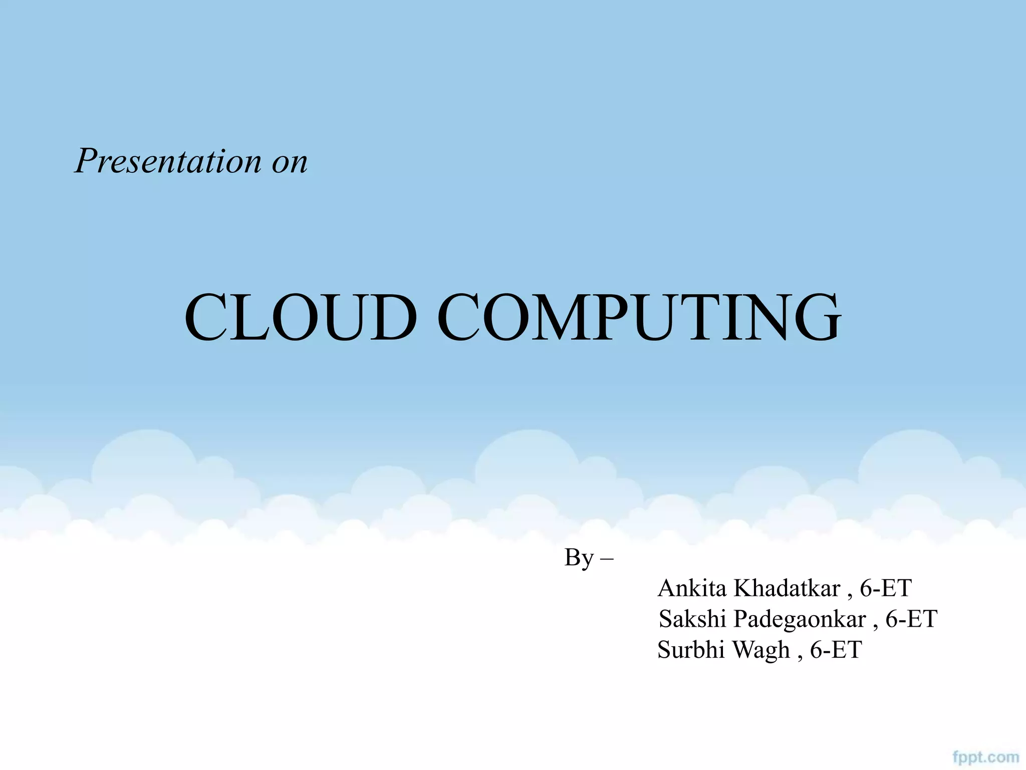 This presentation provides an overview of cloud computing, including definitions, models of cloud services (SaaS, PaaS, IaaS), advantages like scalability and cost savings, and disadvantages like lack of control. It defines cloud computing as sharing virtualized computing resources over a network on-demand, with users paying only for what they use. The major cloud service models - SaaS, PaaS, and IaaS - are explained in terms of the infrastructure and services provided to users at each level.