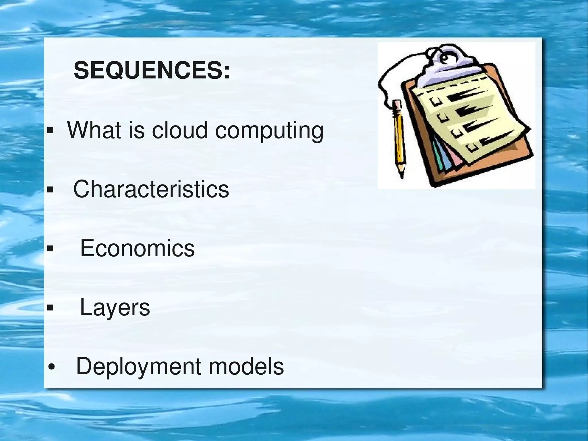 This document discusses cloud computing and provides details on its key characteristics, economics, layers, deployment models, cloud storage, issues, and future. It defines cloud computing as internet-based development and services that provide online tools for email, productivity software, business applications, and data storage from any location. Some benefits include eliminating costs of on-site hardware/software and IT support staff. The document outlines the different layers of cloud computing including clients, applications, platforms, and infrastructure. It also discusses public vs private vs hybrid cloud models and issues regarding security, reliability, ownership, and intellectual property.